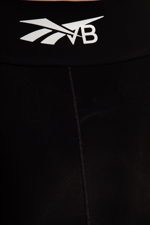Short, black leggings from Reebok x Victoria Beckham. Decorated with a white logo print, this pair is complete with an elastic waistband.