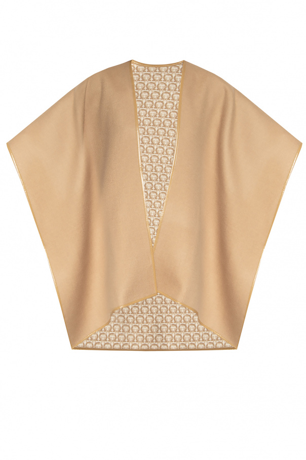 Beige poncho from Salvatore Ferragamo. Made of wool, this design features a leather trim and the brand’s signature Gancini pattern on one side.