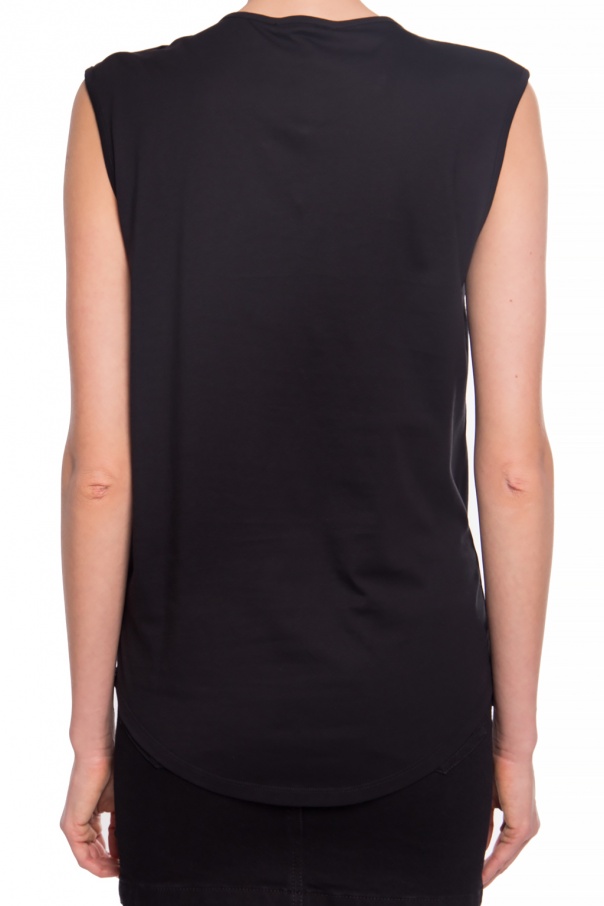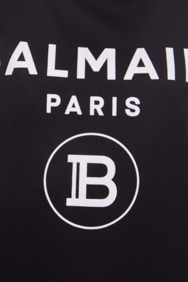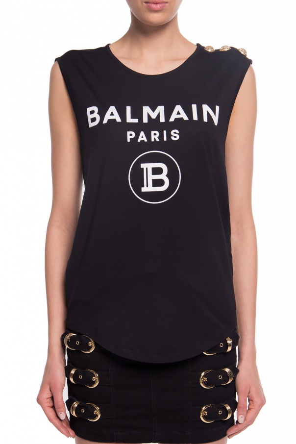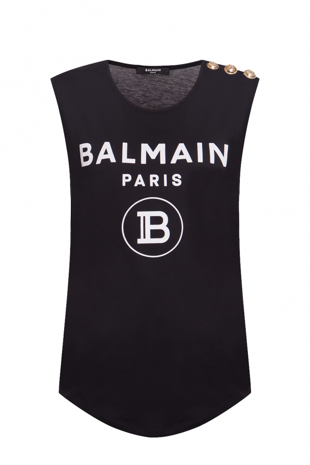 Black sleeveless top from Balmain. Made of cotton. Decorated with a white logo print. 3 decorative buttons in gold-tone at on shoulder. Round neck.
