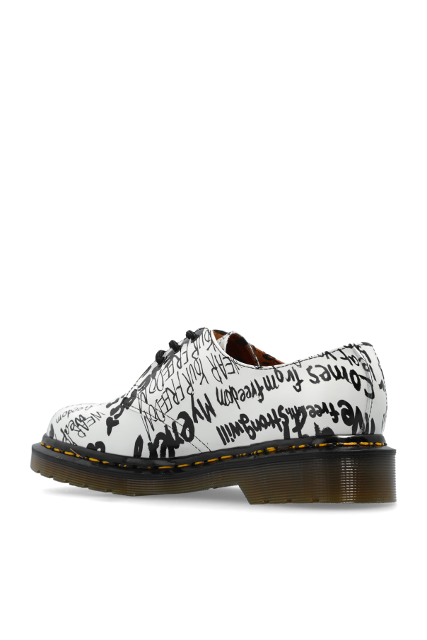 Introducing the COMME des GARÇONS x Dr. Martens Oxford shoes: a bold synthesis of classic style and contemporary expression. Crafted from premium leather, these shoes feature a distinctive black text pattern against a stark white background. Phrases like "WEAR YOUR FREEDOM" are interwoven throughout, encapsulating themes of liberty and individual expression. The iconic Dr. Martens' traits are unmistakably present - from the signature yellow stitching bordering the sole to the dark brown, anti-slip rubber sole renowned for its durability and resistance to wear. These elements not only signify the quality and heritage of Dr. Martens but also ensure lasting comfort and stability. An interior glimpse reveals a collaboration of excellence, with both Dr. Martens and COMME des GARÇONS logos embossed on the leather insole, asserting the exclusivity of this partnership. Moreover, the proud declaration of "Made in England" elevates the shoes' prestige, anchoring them in a legacy of superior craftsmanship. These shoes are a statement of elegance and audacity, capable of captivating attention and adding a distinctive flair to any ensemble. With their classic Oxford silhouette and eye-catching design, they traverse the boundary between traditional sophistication and modern boldness. Why Purchase This Product? Exclusive COMME des GARÇONS x Dr. Martens collaboration Premium leather construction for lasting quality Unique text pattern promoting themes of freedom and self-expression Iconic Dr. Martens durability and comfort with anti-slip rubber sole Manufactured in England, offering unmatched craftsmanship