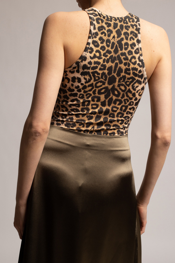 Beige and black ‘Jamie’ slip bodysuit from AllSaints. Crafted from cotton, this style features a round neck, press-stud closures at the bottom and an all-over leopard print.