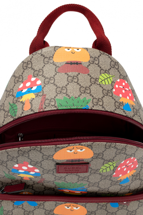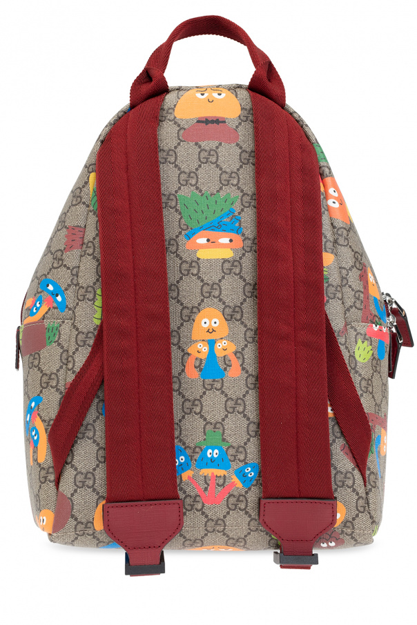 Beige and brown backpack from Gucci Kids. Crafted from GG Supreme canvas, this design fastens with a two-way zip and is decorated with a multicolored print and logo-embossed patch in maroon. It is complete with a front zip pocket, half-round handle, adjustable strap, silver-tone metal hardware and one internal compartment with one zip pocket.