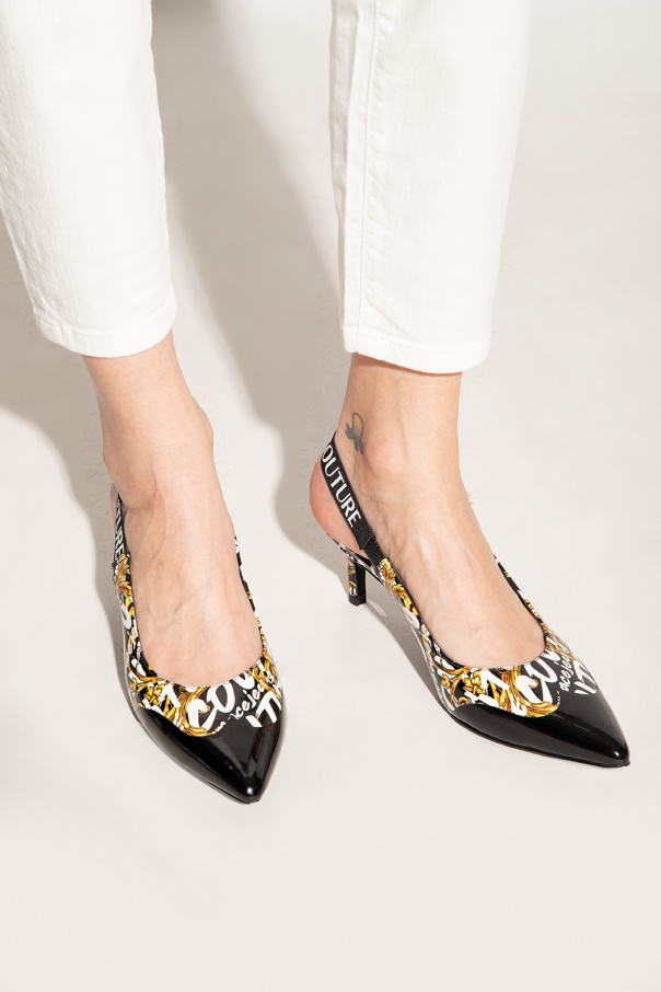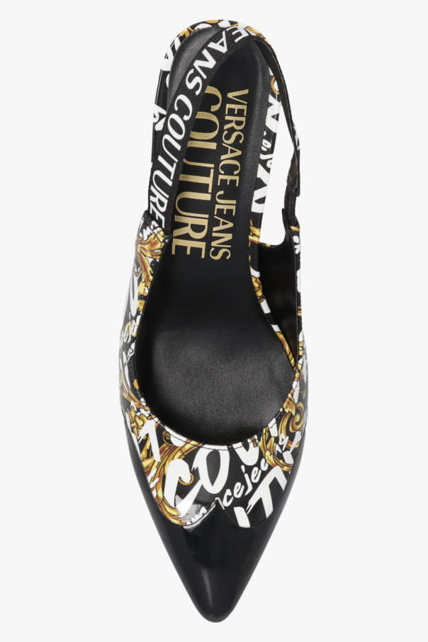 Black slingback pumps from Versace Jeans Couture. Made of patent faux leather, this pair is complete with an elastic strap with a logo print, yellow, brown and white ‘Logo Brush Couture’ pattern and black rubber sole.