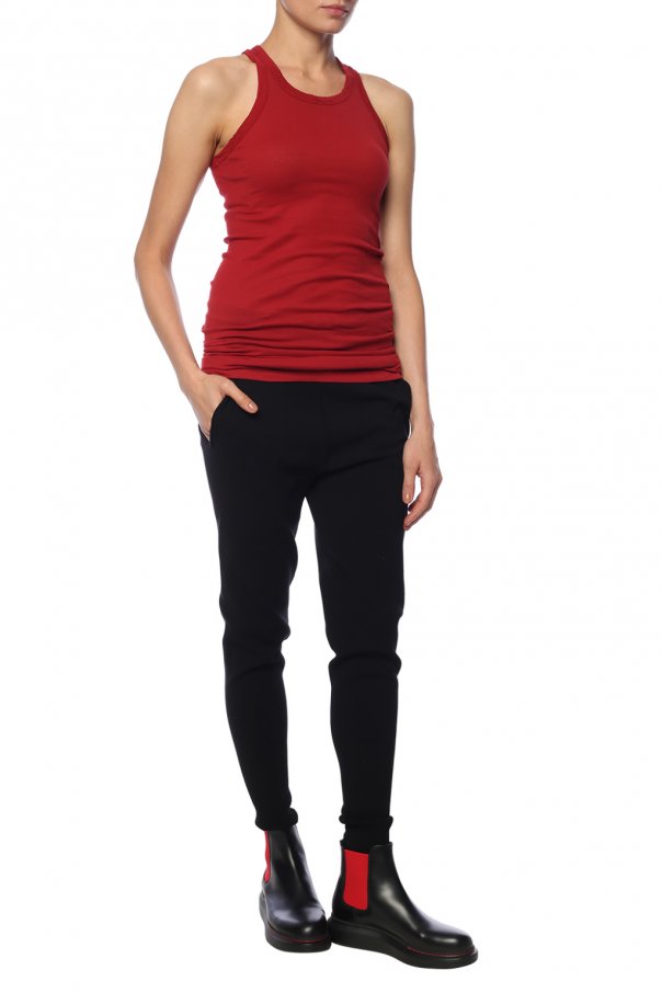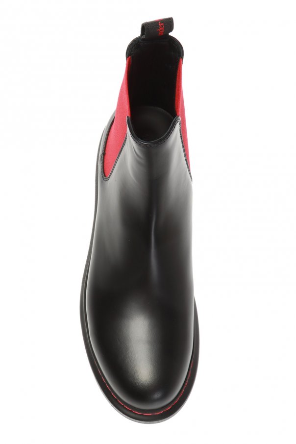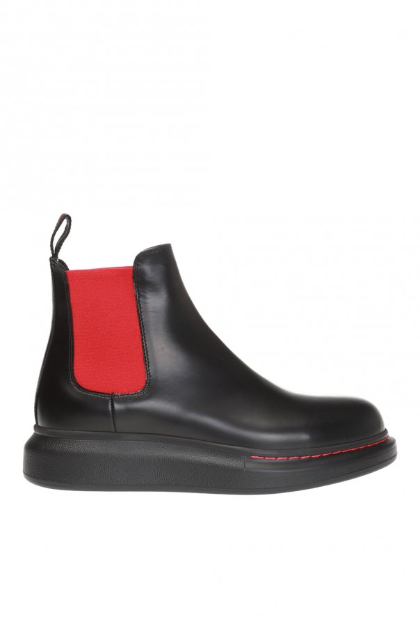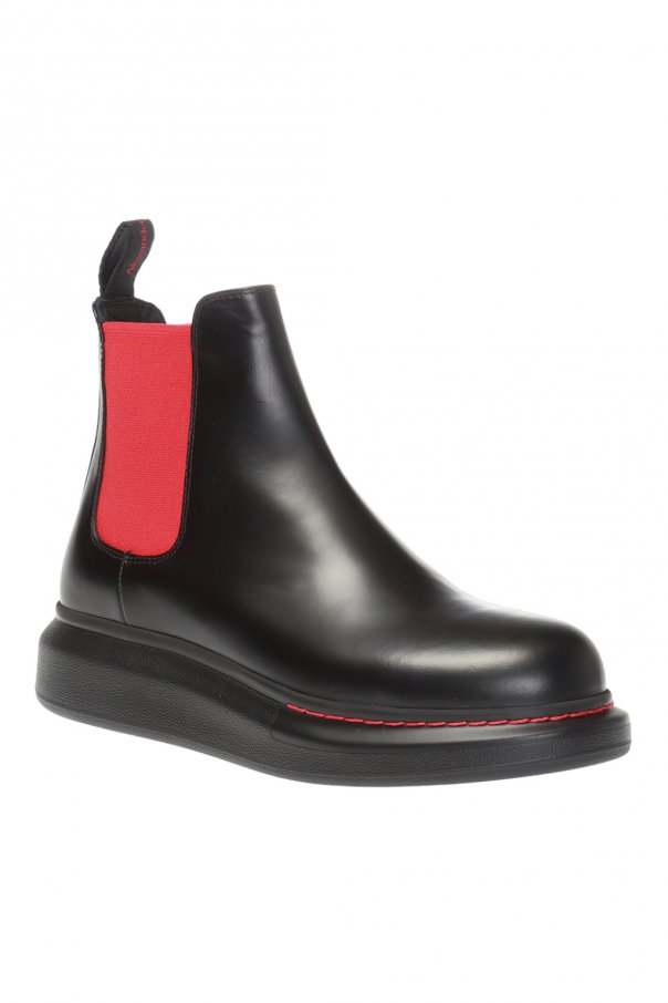 Black slip-on ankle boots from Alexander McQueen. Made of leather. Red elastic panels on the sides. Grosgrain strap featuring a logo embroidery at the back. Black rubber sole.