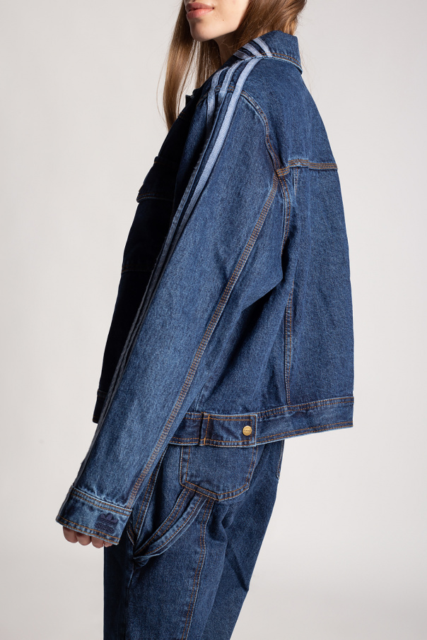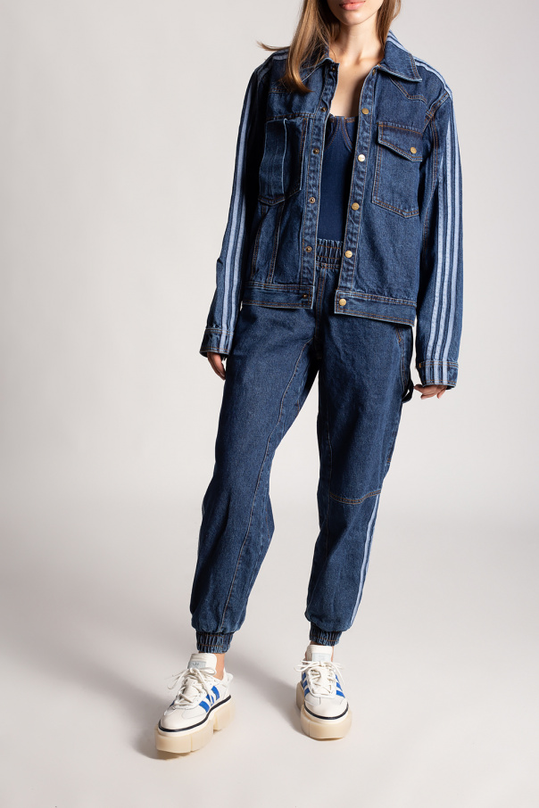 Navy denim jacket from ADIDAS Originals x Ivy Park. Fastened with snaps, this design features three slip pockets, one zipped flap pocket and the label’s signature three stripes down the sleeves.