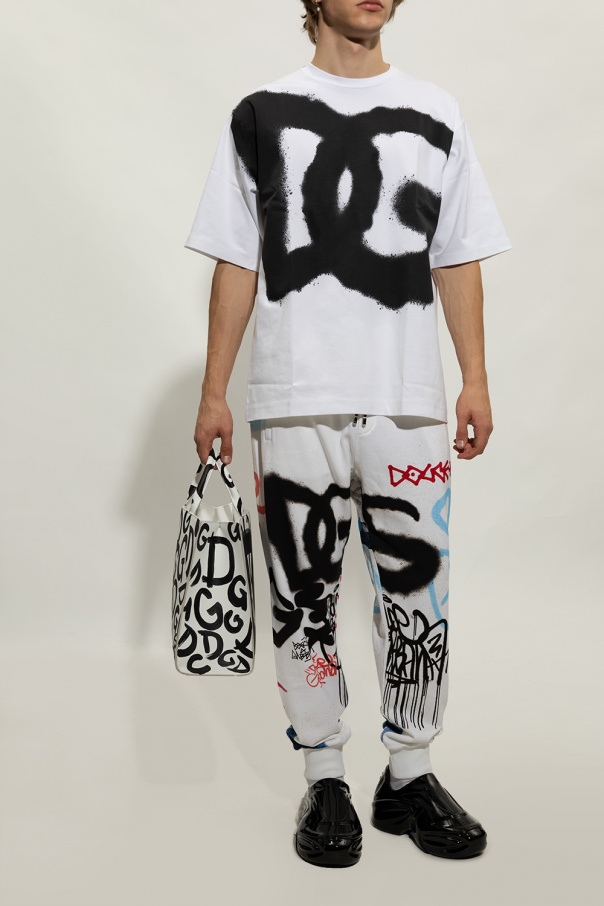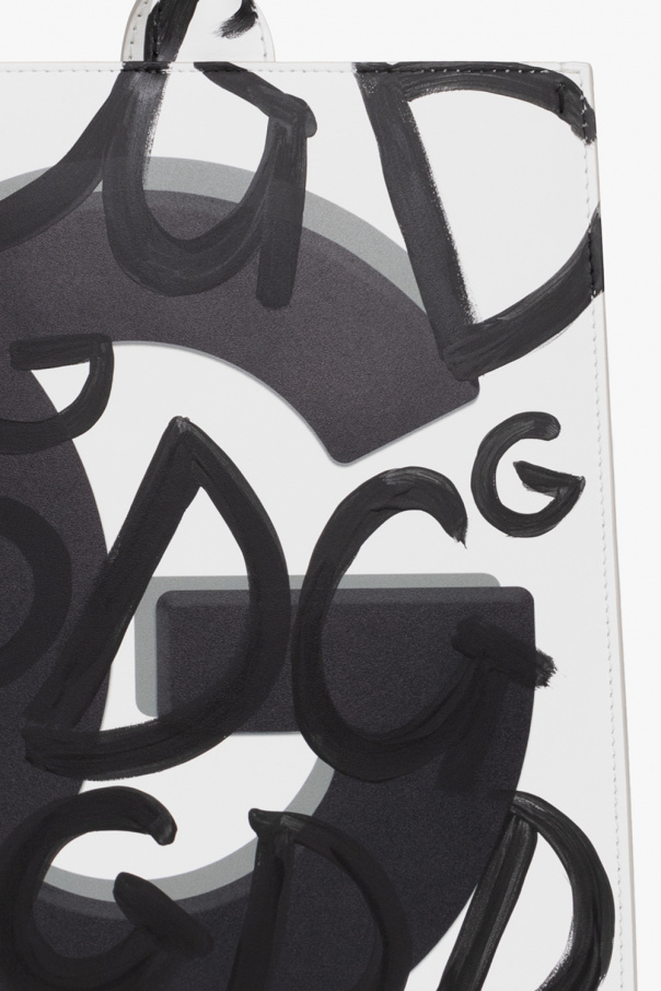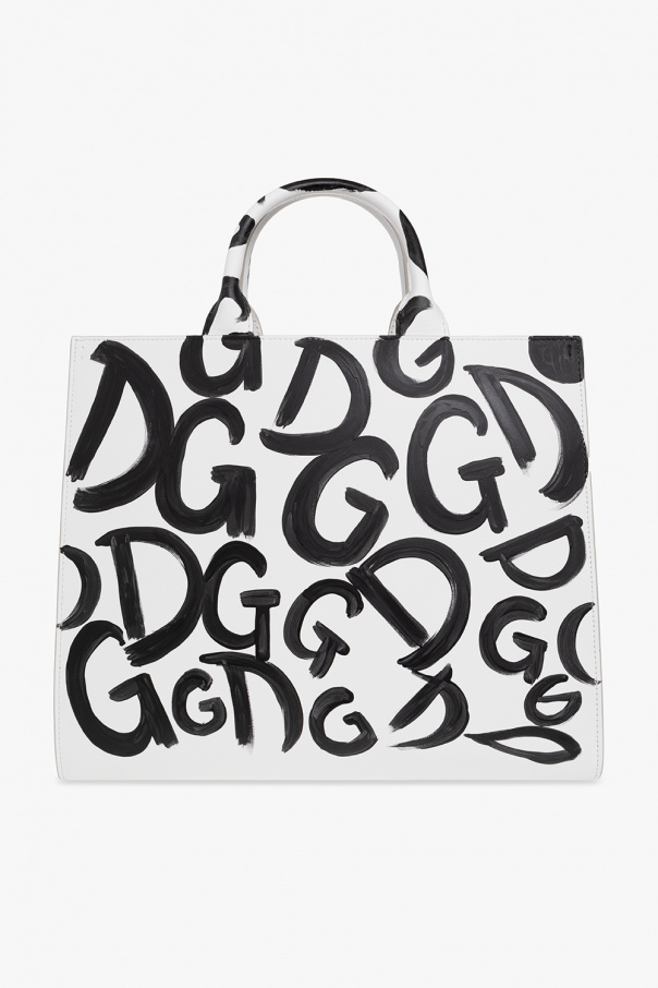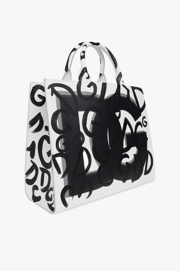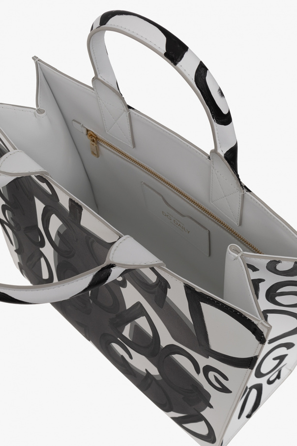 White ‘DG Daily’ shopper bag from Dolce & Gabbana. Crafted from calf leather, this design showcases a black and grey graphic print, two half-round handles, gold-tone metal hardware and one internal compartment with one zip pocket, one slip pocket and one card slot.