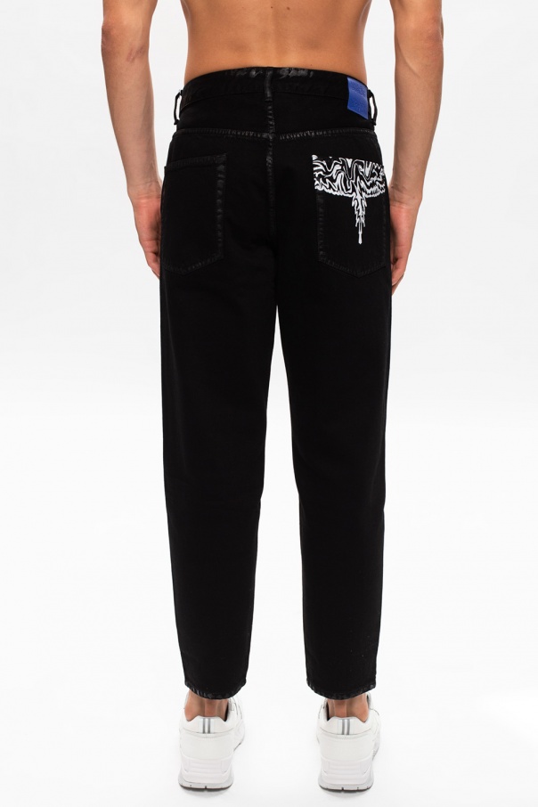 Black jeans from Marcelo Burlon. Falling down with legs that taper towards the ankles, this 5-pocket design fastens via buttons and is complete with a blue logo patch and a white graphic print.