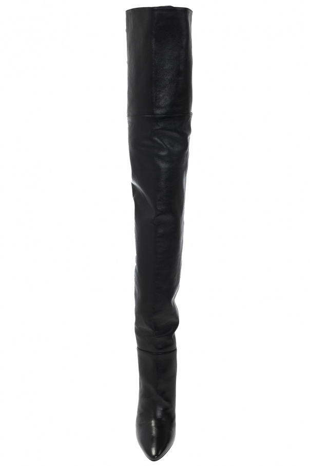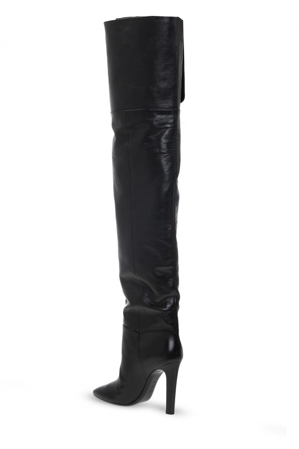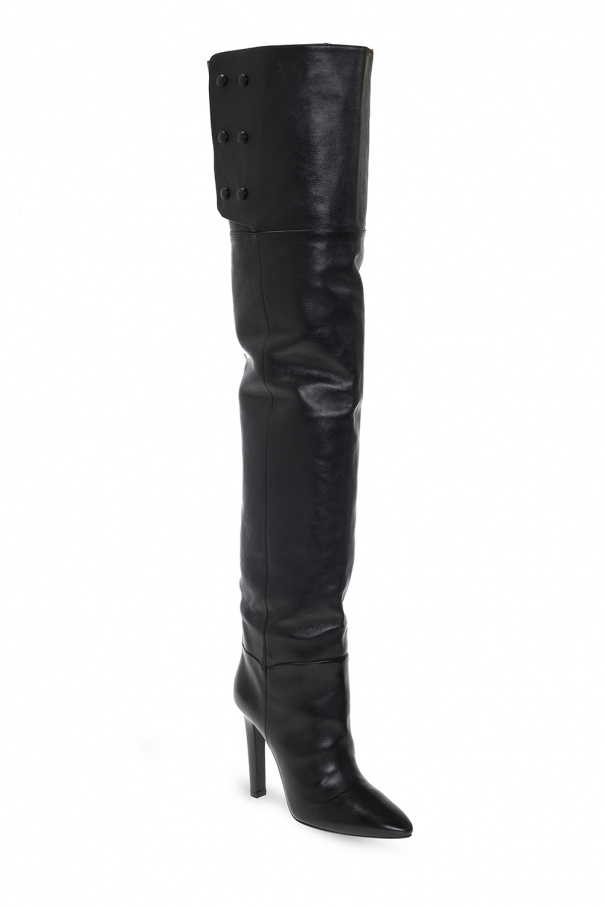 Black ‘Jane’ heeled over-the-knee boots from Saint Laurent. Crafted from calf leather, this model sits on a black leather sole and features snap closures on the side.