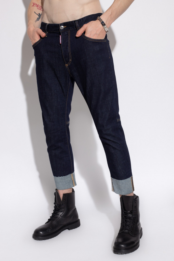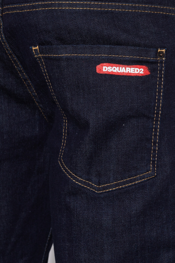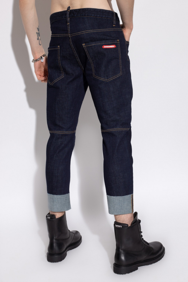 Navy ‘Sailor’ jeans from Dsquared2. Fastened with buttons, this garment features a logo patch, red print, five slip pockets and tapered legs with decorative trims.