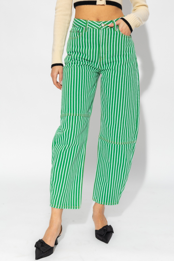 Green and cream jeans from Ganni. Made of organic cotton, this pair has slightly tapered legs and is complete with a zip and button closure, stripe pattern, logo patch at the back and five slip pockets.