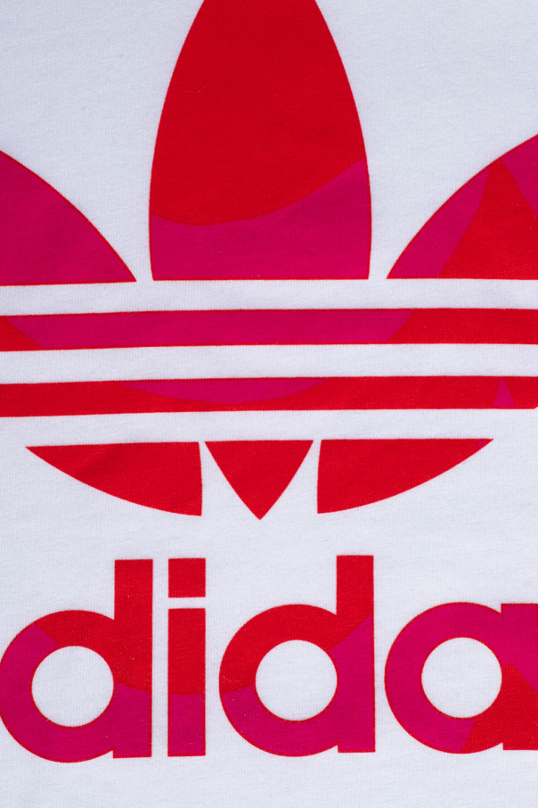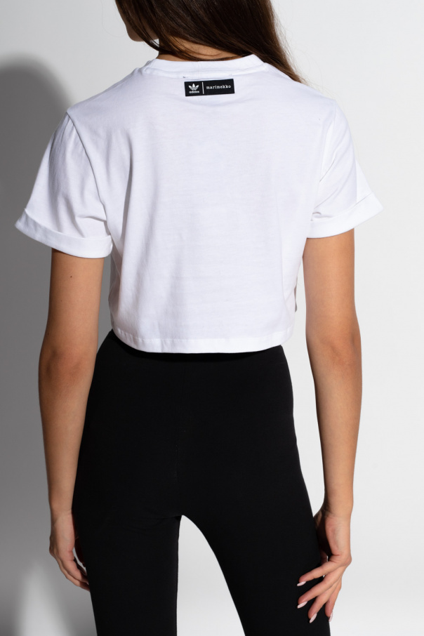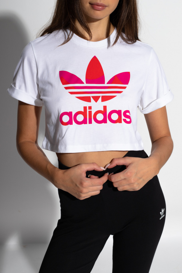 White crewneck T-shirt from ADIDAS Originals, the ‘Marimekko’ collection. Crafted from cotton with a cropped silhouette, this style showcases a red and pink graphic logo print on the front and short sleeves with turn-up cuffs.