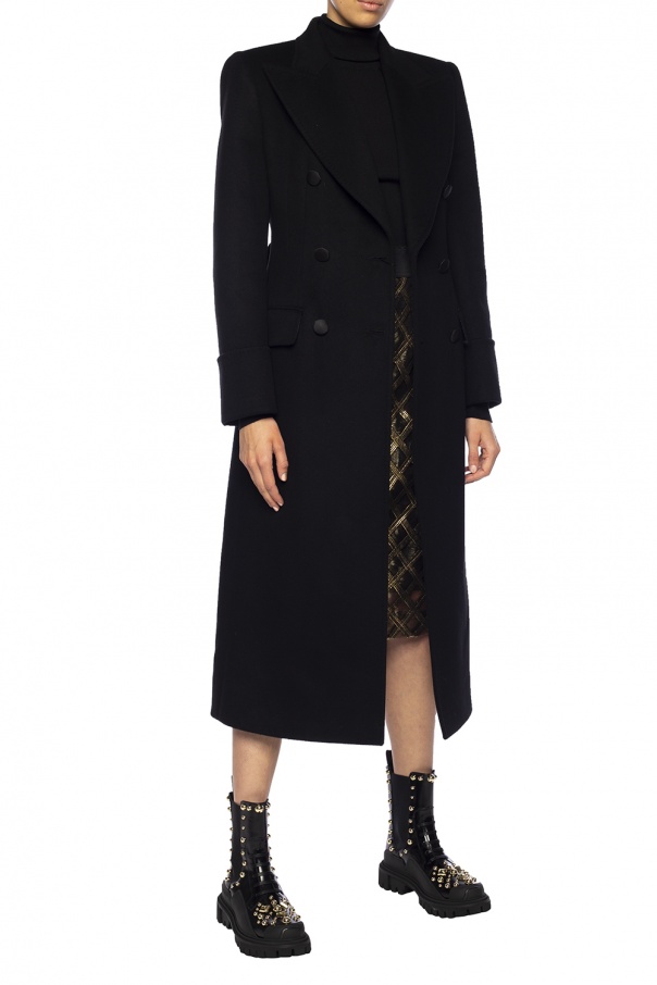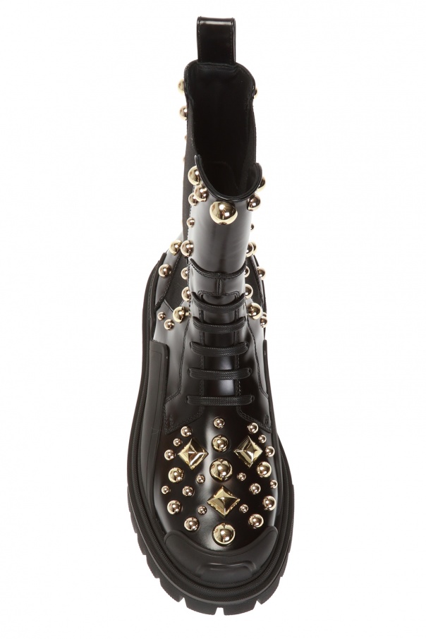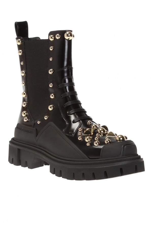 Black ‘Combat’ platform shoes from Dolce & Gabbana. Made of calf leather. Encrusted with gold-tone studs. They feature tactile logo and elastic panels on the sides and black rubber sole at the base.