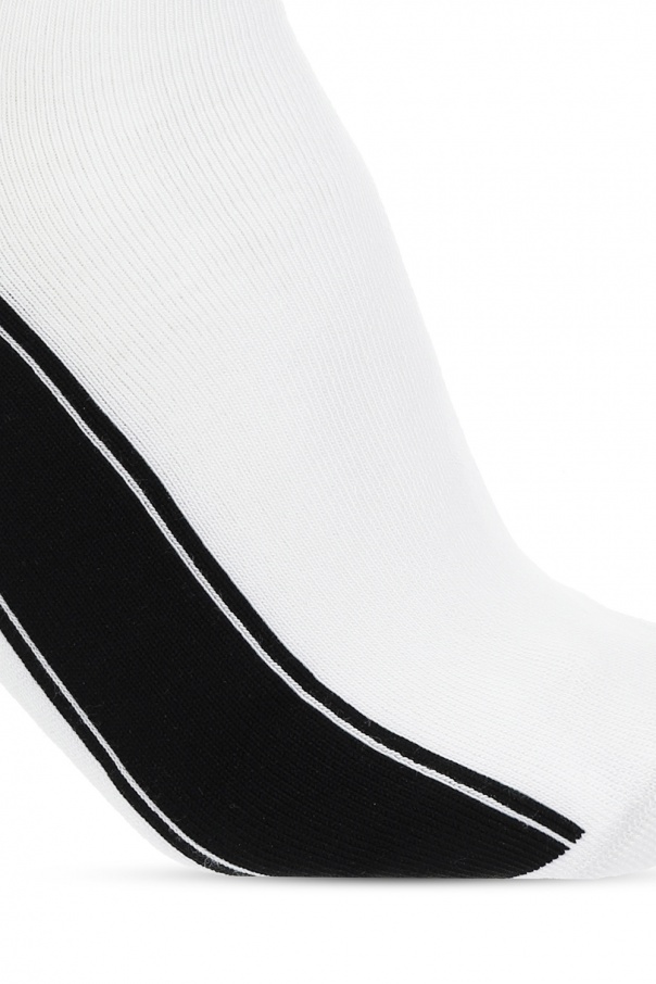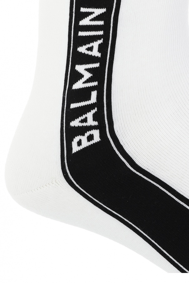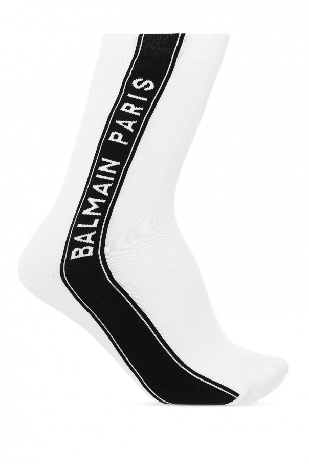 White and black long socks from Balmain. Crafted from cotton, this pair is decorated with a logo embroidery.