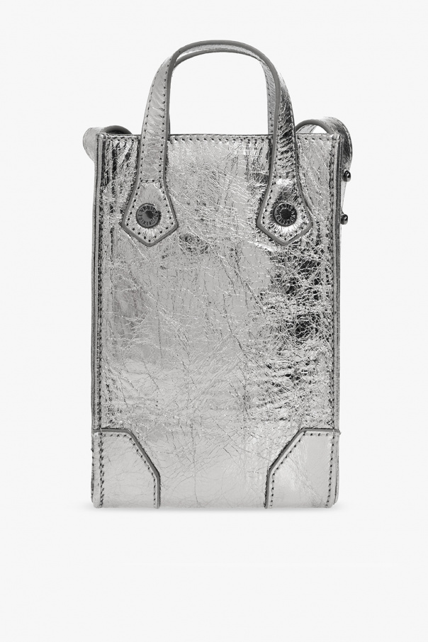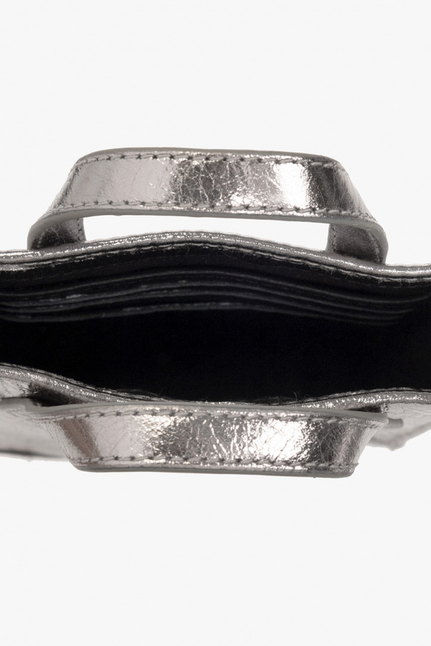 Silver-tone ‘Sunny#2’ phone pouch from Zadig & Voltaire. Made of leather with a metallic finish and vintage effect, this model features a metal appliqué with the brand’s signature wing motif, two half-round handles, adjustable shoulder straps, antique silver-tone metal hardware and one internal compartment with one slip pocket and three card slots.