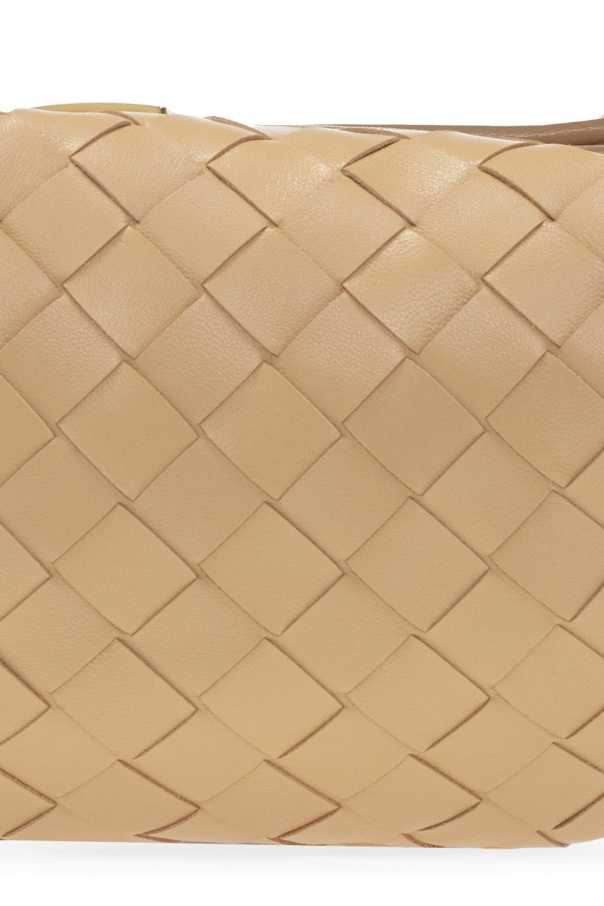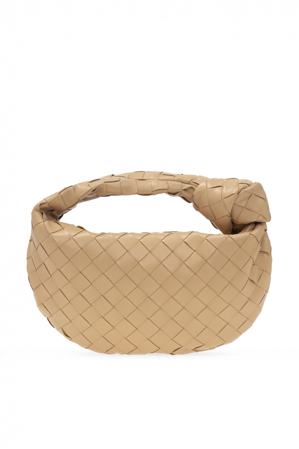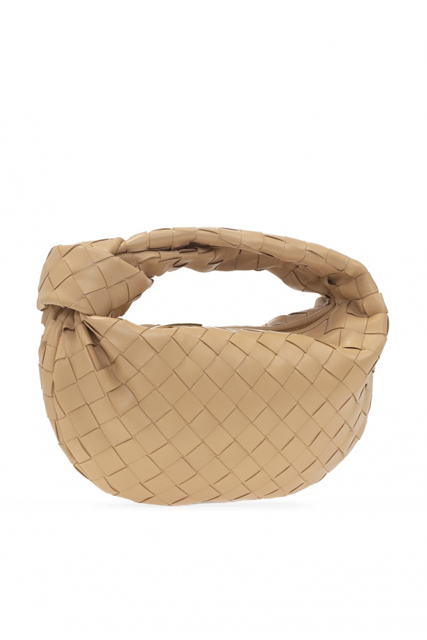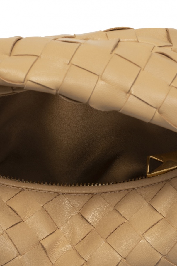 Beige ‘Jodie Mini’ handbag from Bottega Veneta. Crafted from lamb leather and calf leather with the brand's iconic ‘Intrecciato’ weave, this design features a zip fastening, a half-round handle, gold-tone metal hardware and one internal compartment.