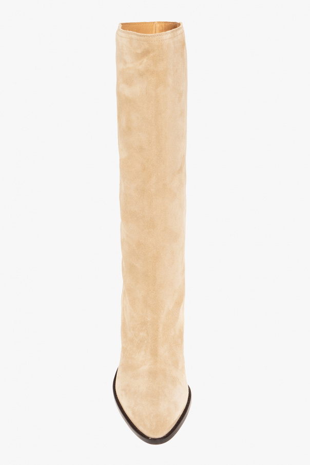 Beige ‘Rouxy’ slip-on boots from Isabel Marant. Crafted from calf suede, this pair features a brown cone heel and beige leather sole.