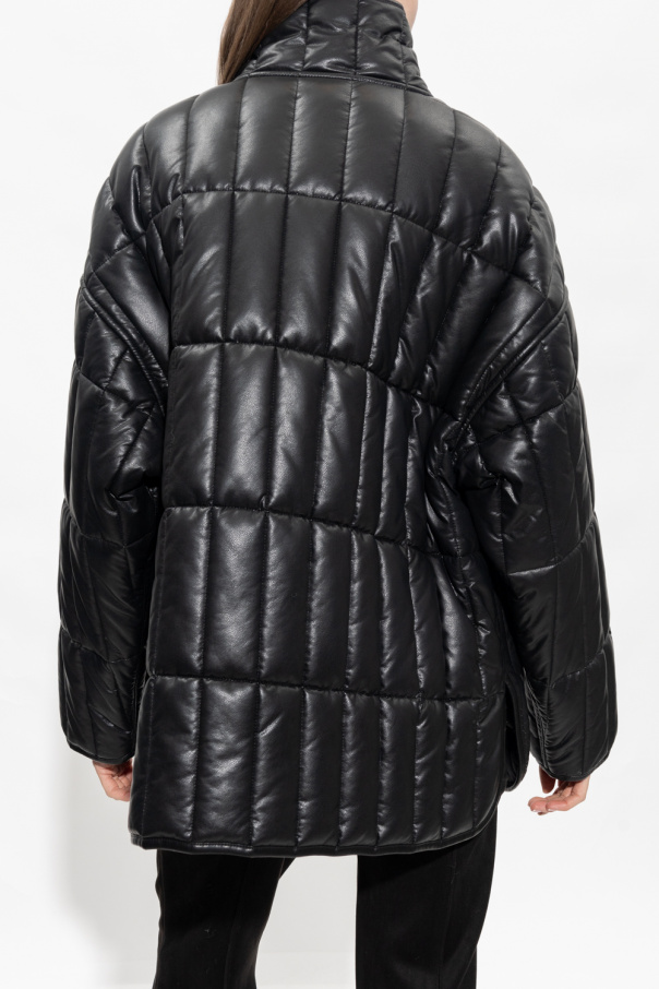 Black ‘Evelina’ quilted jacket from Stand Studio. Made of faux leather, this oversize garment features a stand collar, snap fastenings, two front pockets, side vents and long sleeves.