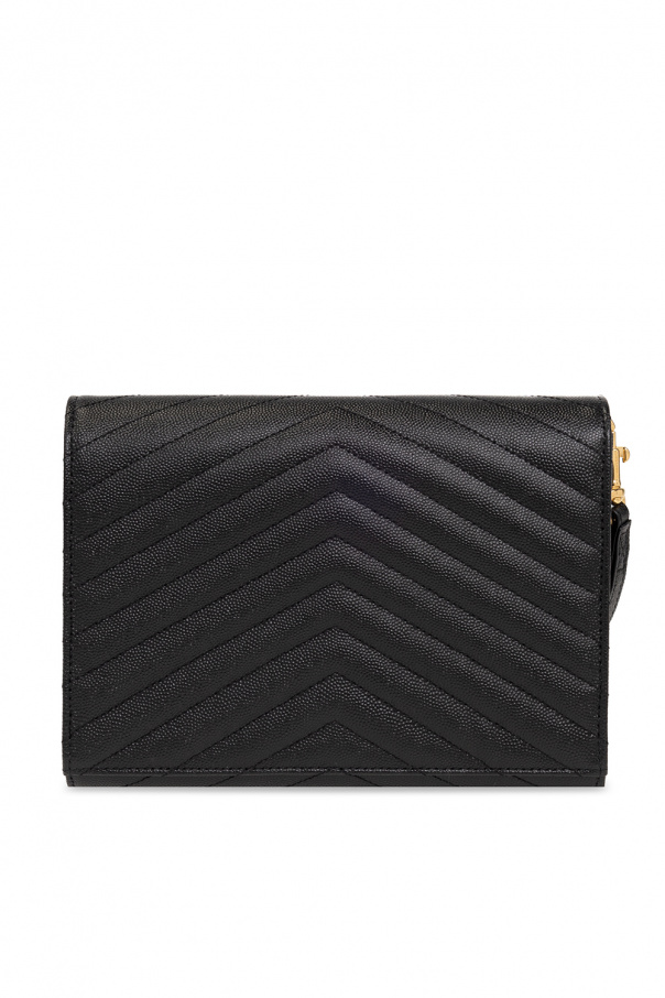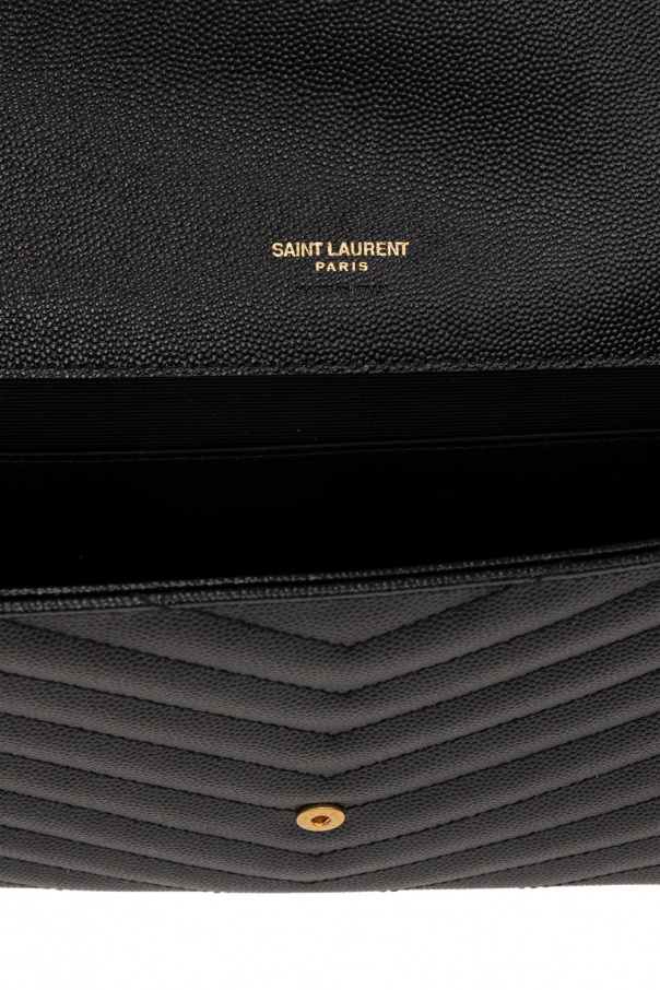 Black ‘Cassandra’ quilted clutch from Saint Laurent. Crafted from grained calf leather, this design secures with a magnetic snap and showcases a logo application on the front, a removable wrist strap on the side, gold-tone metal hardware and one internal compartment with a slip pocket.