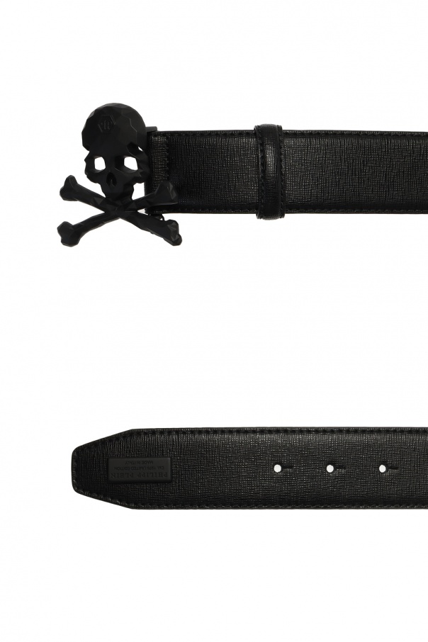 Black belt from Philipp Plein. Made of calf leather. Fastened with a metal skull-shaped buckle in black.
