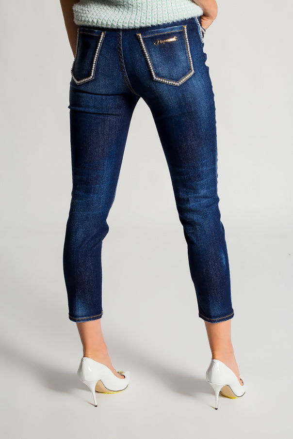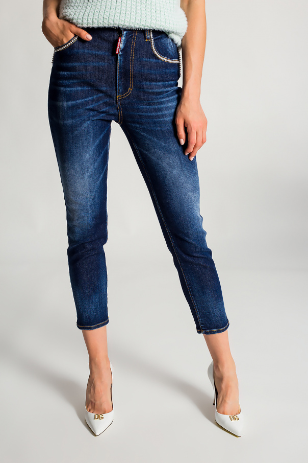 Navy ‘High Waist Cropped Twiggy’ jeans from Dsquared2. Crafted from cotton, this tapered leg design features a zip fly and button, five slip pockets, decorative glass appliqué, gold-tone logo detail and a worn effect.