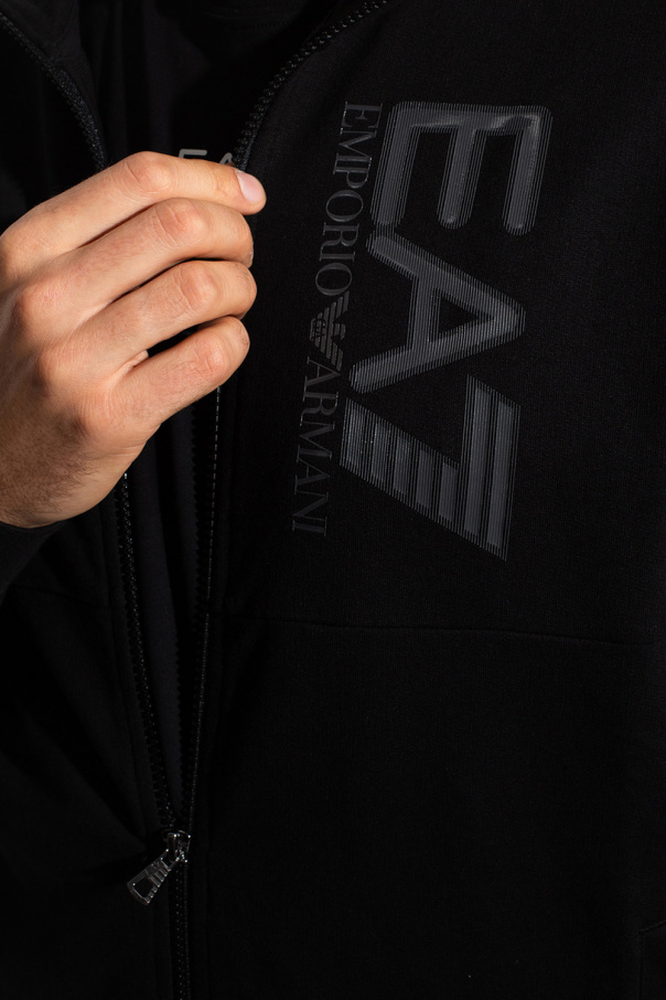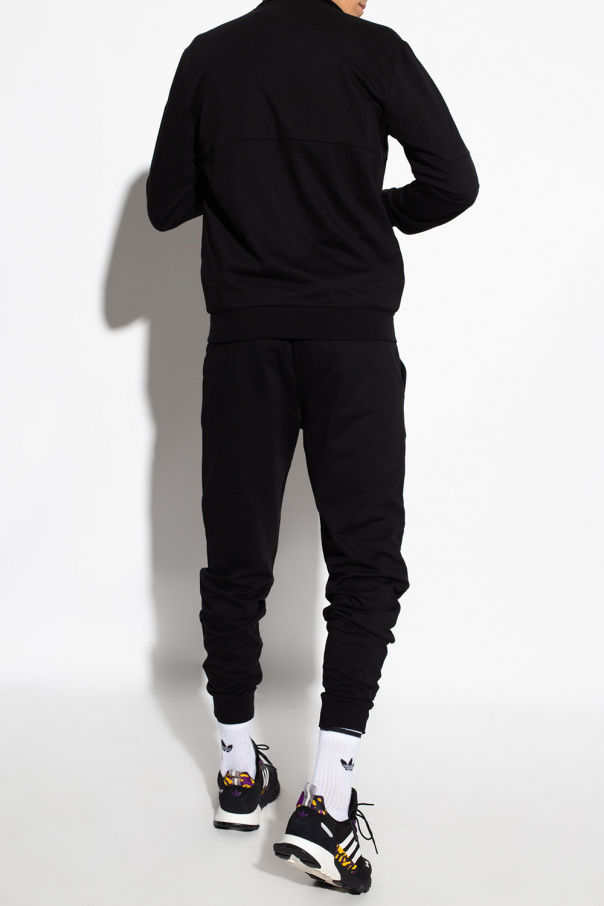Black sweatsuit from EA7 Emporio Armani. Crafted from cotton and printed with the brand's logo in grey, it includes a sweatshirt with a stand-up collar, two slip pockets and a zipper and sweatpants with a drawstring waist, two side seam pockets and tapered legs with elasticated cuffs.
