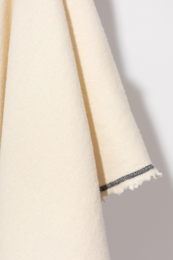 Cream poncho from Jil Sander. Made of merino wool, this style features a relaxed-fitting silhouette, a scarf closure, split sleeves and decorative black straps.
