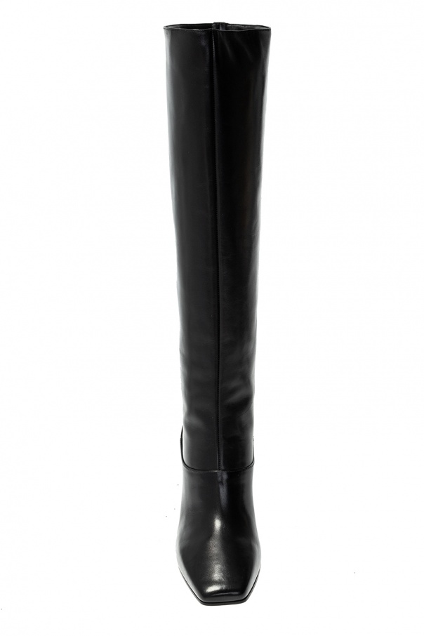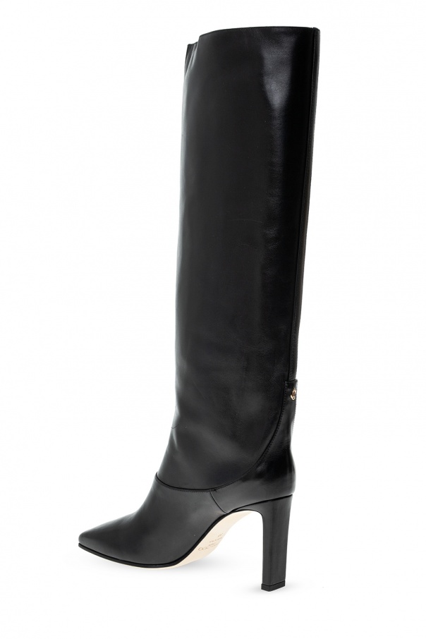Black 'Mahesa' heeled knee-high boots from Jimmy Choo. Crafted from leather, this pair sits on a cream rubber-injected leather sole and showcases tonal seams and metal monogram plaque for the brand recognition.