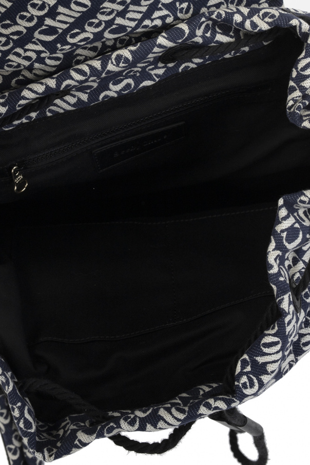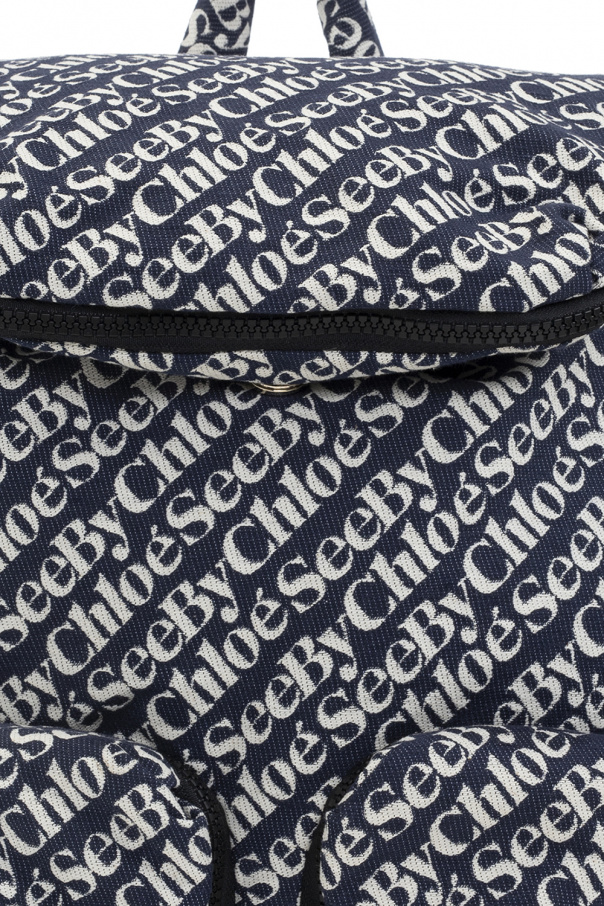 Navy and cream ‘Joy Rider’ backpack from See By Chloé. Fastened with drawstrings, this model features a fold-over top with a zip pocket and magnetic snap. It is complete with a logo embroidery, two front zip pocket, detachable metal keyring, half-round handle, adjustable shoulder strap, gold-tone metal hardware and one internal compartment with two slip pockets and one zip pocket.