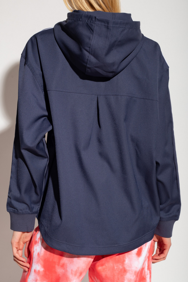 Navy blue sweatshirt with a drawcord-adjustable hood from ADIDAS Originals, the ‘End Plastic Waste’ line. Crafted from a blend including cotton and recycled polyester, this style showcases white Trefoil logo embroidery, the brand's signature three stripes and elasticized trims on the bottom hem and cuffs.