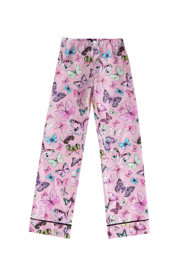 Pink pants from Versace Kid. Made of silk. A rubber sewn in at the waist. Decorated with a colorful, animal print. Loose legs with a straight cut.