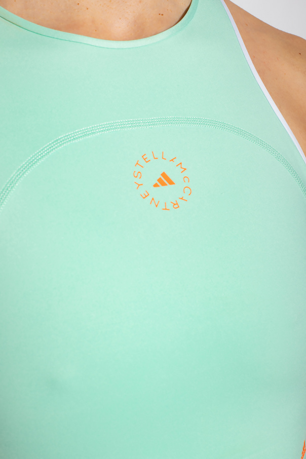 Light green training top from ADIDAS by Stella McCartney. Crafted with a Primeblue yarn which contains 50% Parley Ocean Plastic – reimagined plastic waste, this style features a cropped silhouette with a round neck with white piping, a cut-out back, an elasticated bottom hem and an orange logo application.