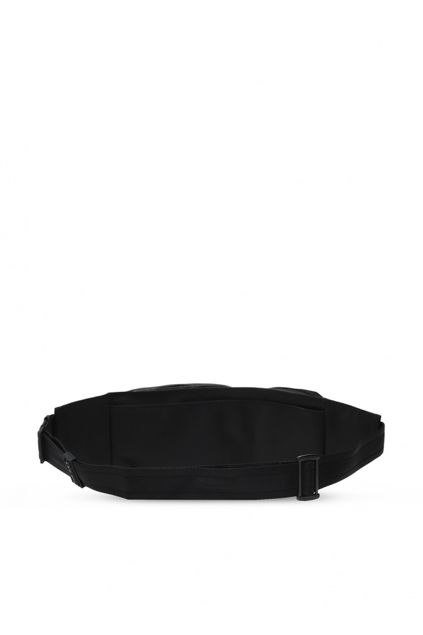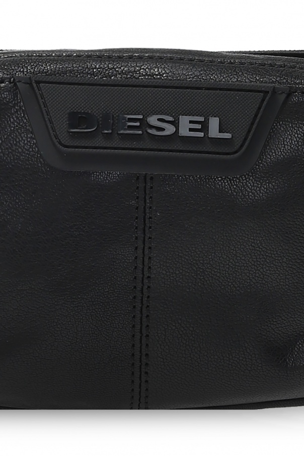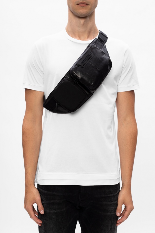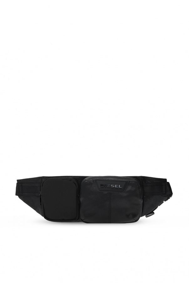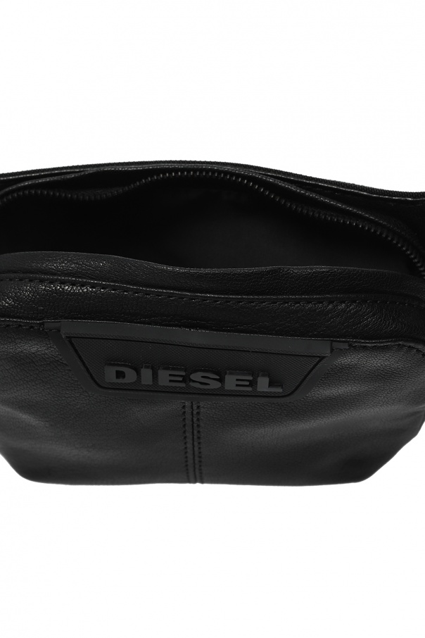 Black belt bag from Diesel. Sporting a tactile logo appliqué, this design fastens via zips and employs ovine leather trims, an adjustable strap and two internal compartments.