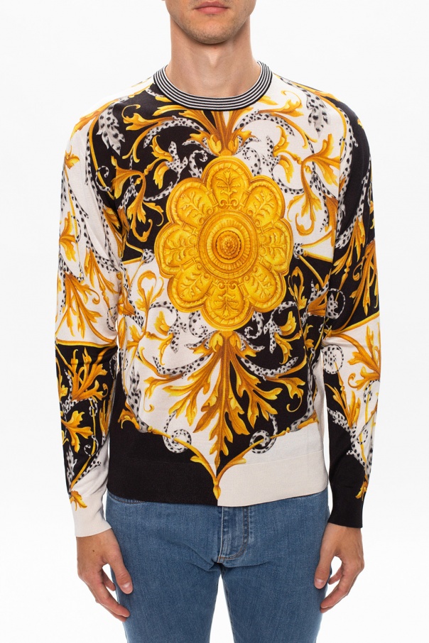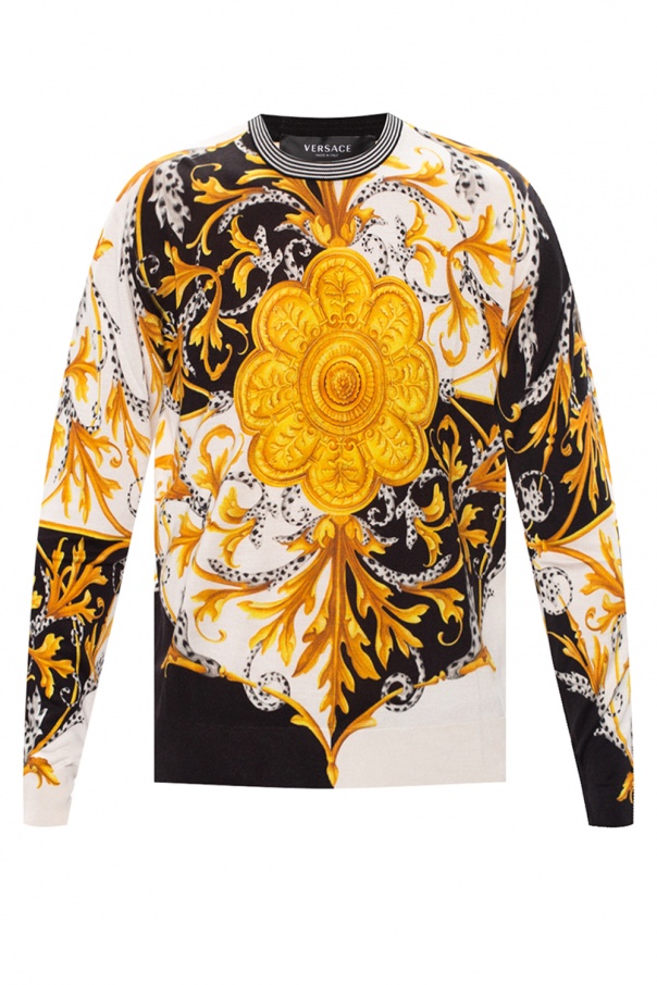 Gold-tone, white and black crewneck sweater from Versace. Woven from silk with the label's highly recognisable Barocco motif, this style is finished with a ribbed bottom hem and cuffs.