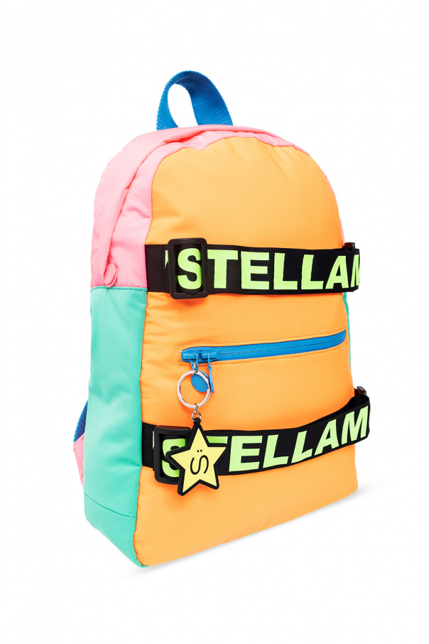 Multicoloured backpack from Stella McCartney Kids. Crafted from fluorocarbon-free recycled polyester with water repellent properties, this design features a two-way zip fastening, a zip pocket with a detachable star charm on the front, a top half-round handle, two adjustable black straps with a printed logo, and one internal compartment.