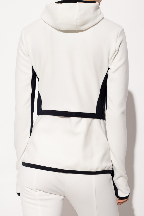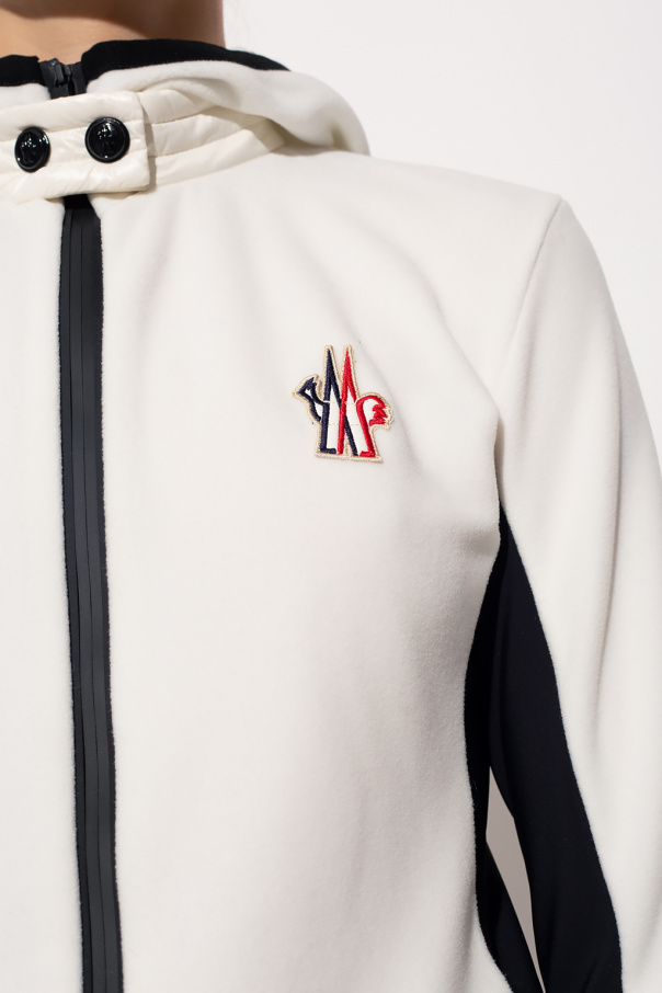 White hoodie from Moncler Grenoble. Emblazoned with a white, red and navy blue logo patch, this style features zip and snap fastenings, black panelling, two zipped pockets and long sleeves.
