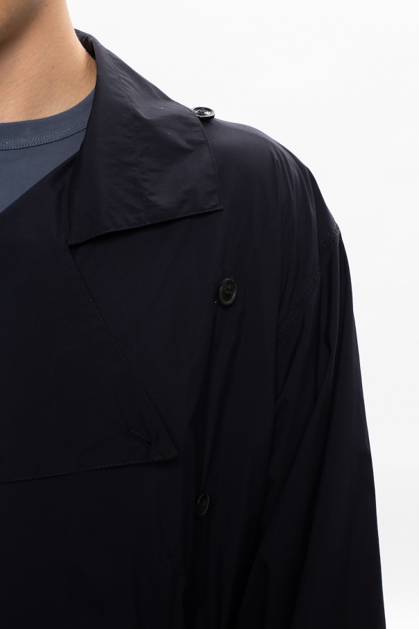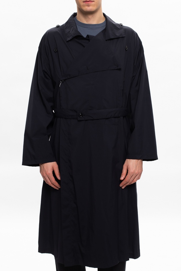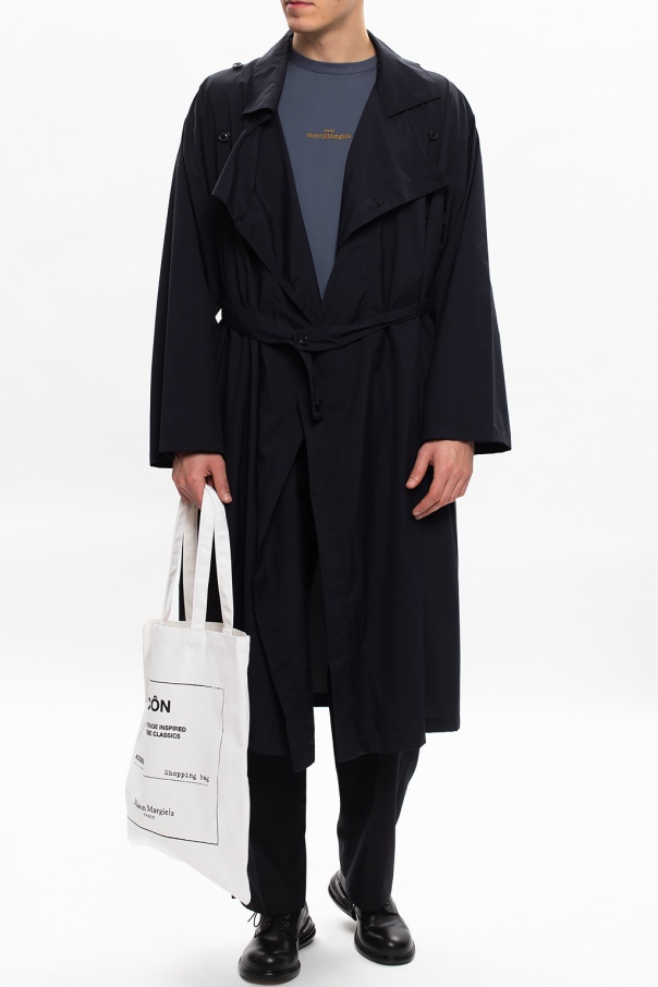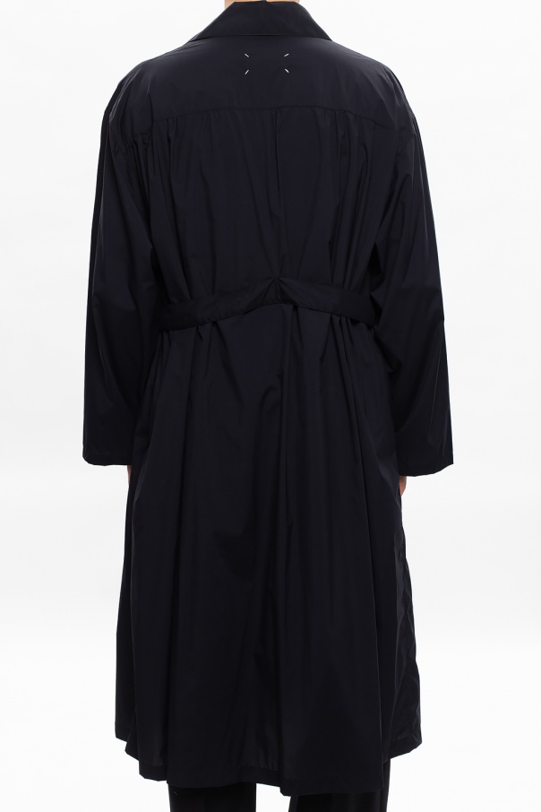 Black coat from Maison Margiela. Spun from synthetic yarns, this style boasts double-breasted design with button closing, an additional fastener at the waist, two welt pockets and ample sleeves.