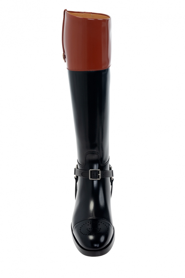 Black and brown knee-high boots from Gucci. Crafted from leather with a slip-on silhouette, this model features a perforated logo on the toe, a black rubber sole and a harness strap with a buckle and Horsebit.