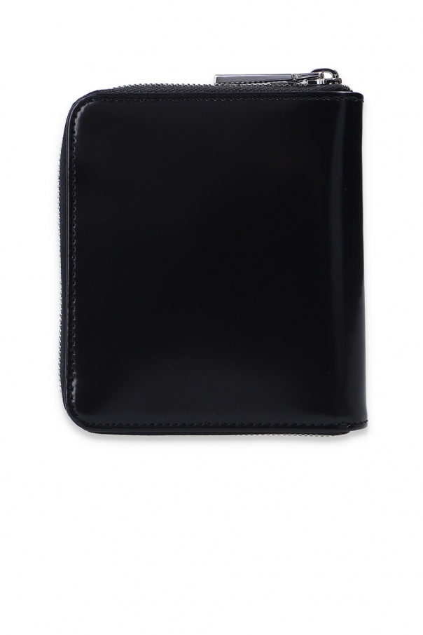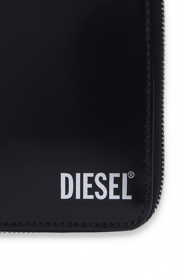 Black wallet from Diesel. Crafted from patent cow leather, this accessory fastens via a zip and showcases a silver-tone logo print for the brand recognition, silver-tone metal details as well as interior with a bills compartment, one slip pocket, one snap-fastened coins pocket and four card slots.