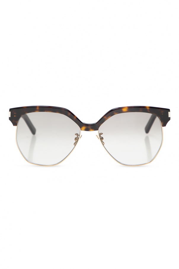 Black and brown ‘SL 408’ sunglasses from Saint Laurent. Decorated with a leopard print, this model features an embossed logo and certificated blue lenses with UVA/UVB protection.
