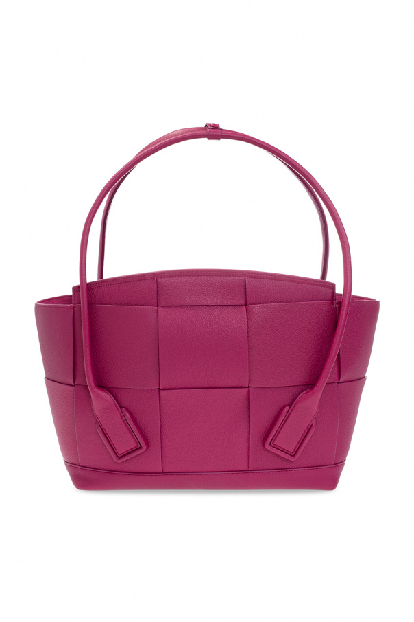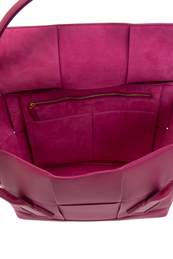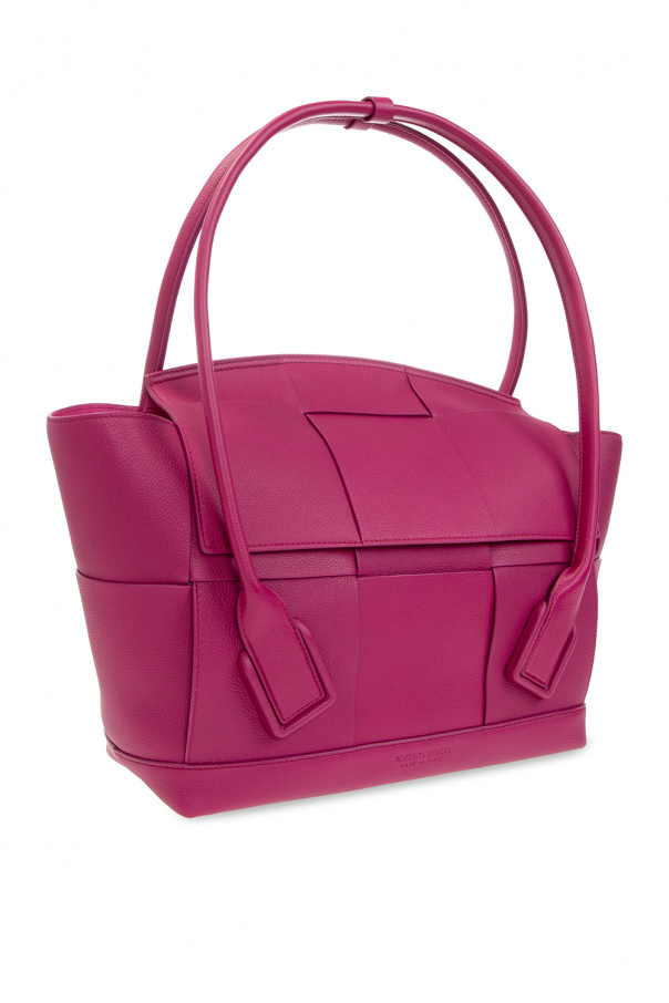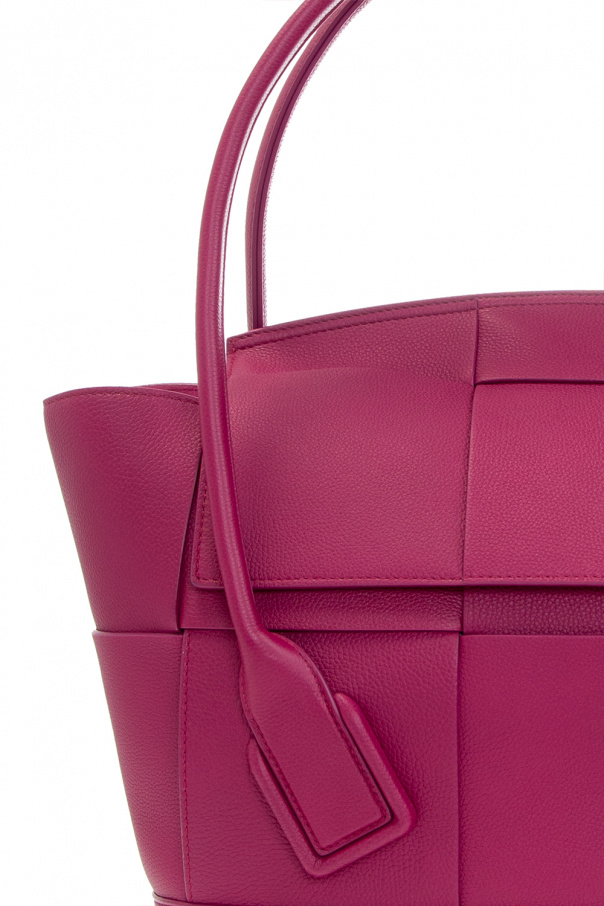 Dark pink ‘Arco Medium’ handbag from Bottega Veneta. Crafted from calf leather, this design showcases the brand's iconic Intrecciato weave, two half-round handles and one internal compartment with two slip pockets and one zip pocket.