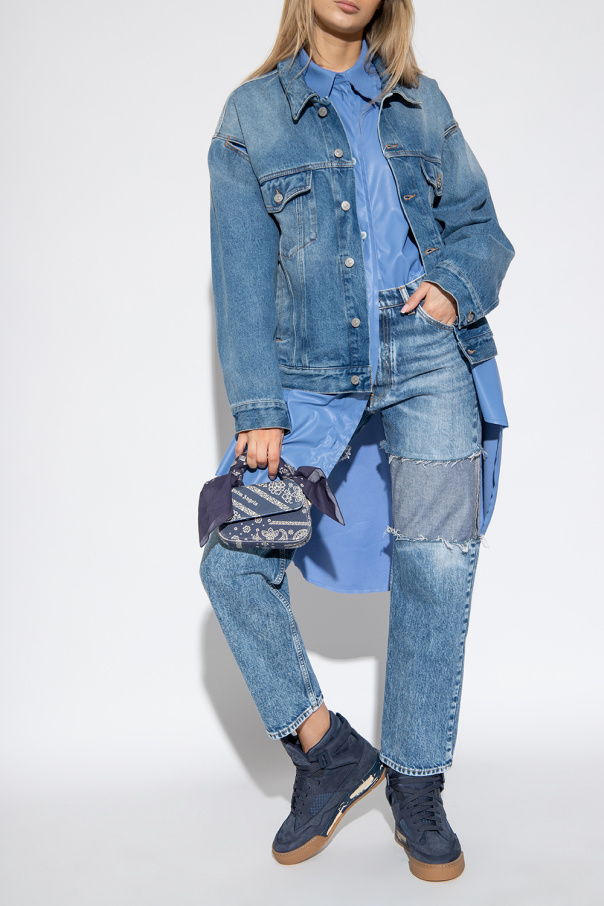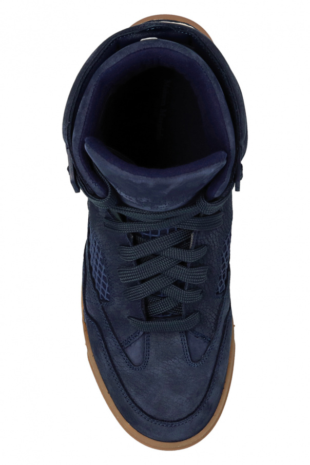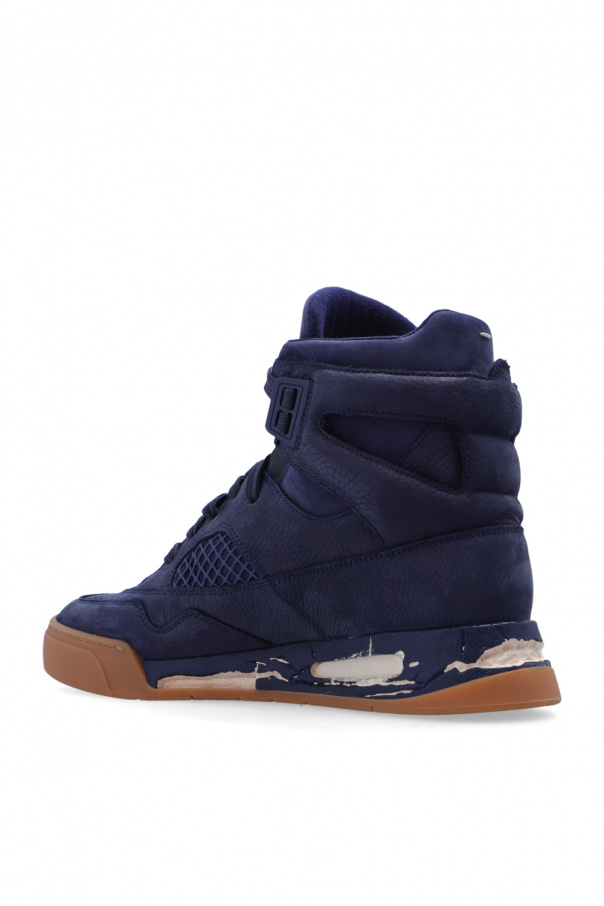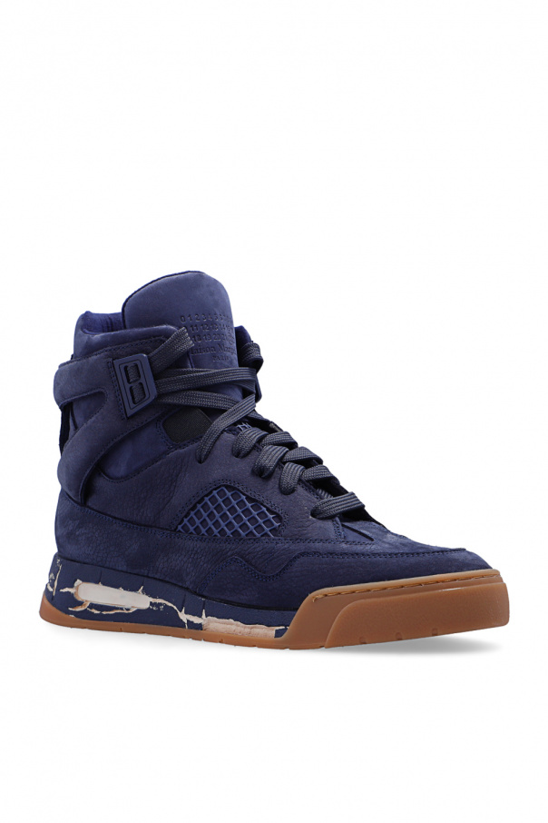 Navy blue sneakers from Maison Margiela. Crafted from leather and fabric, this lace-up model features a high-top silhouette, an embossed logo on the tongue, decorative mesh trims on the sides and a beige, cream and navy blue rubber sole with a vintage treatment.