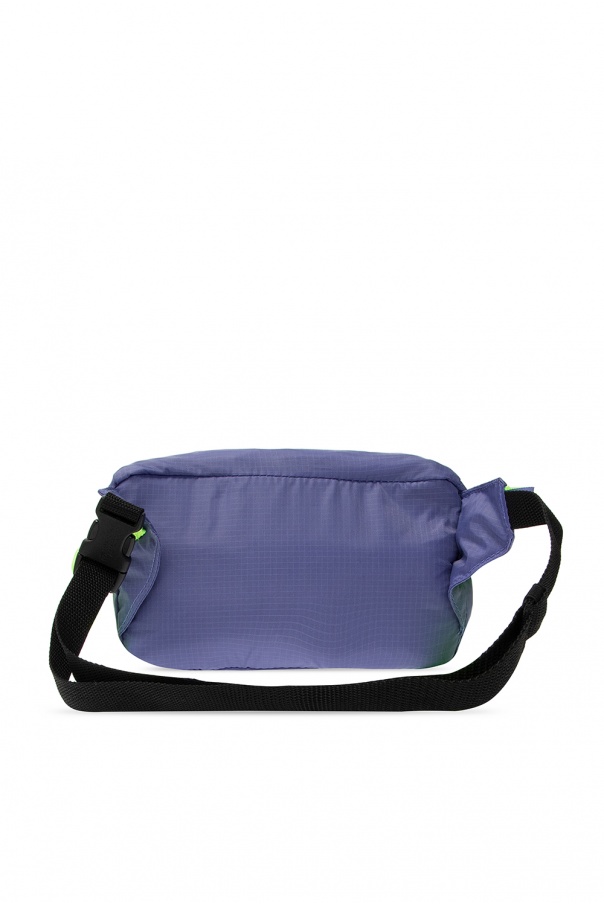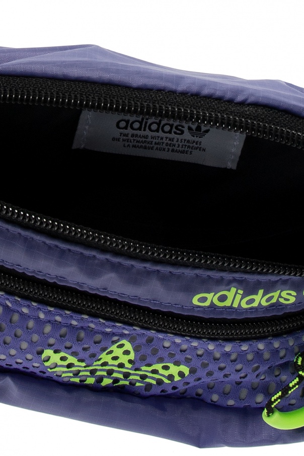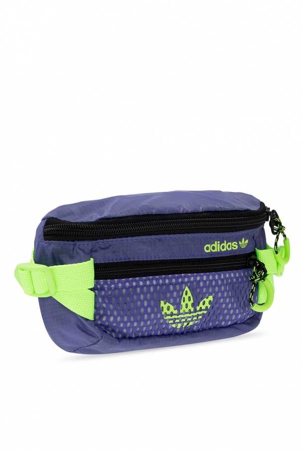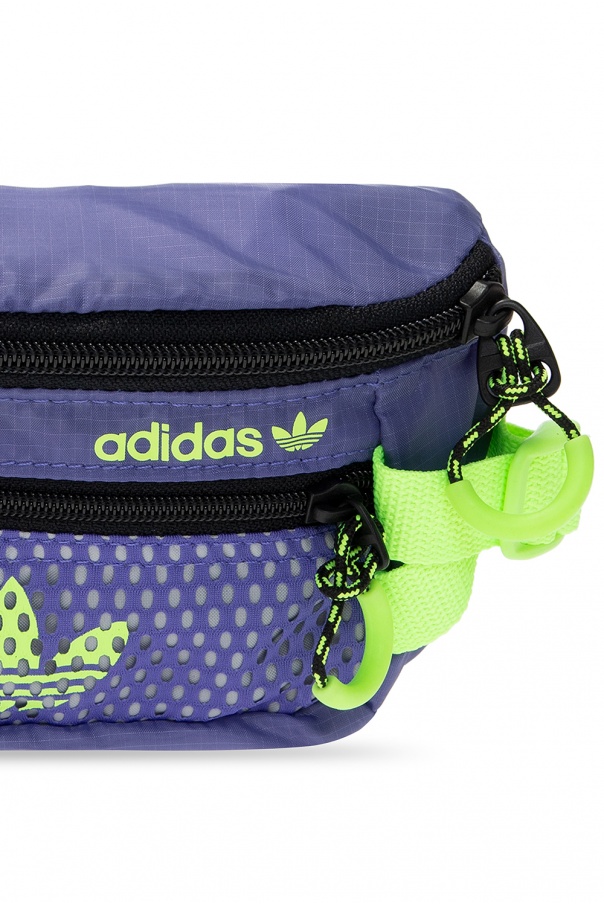 Purple belt bag from ADIDAS Originals. Crafted from a durable Ripstop fabric and mesh, this design fastens via a zip and showcases a neon green logo print. It is complete with an external zipped pocket on the front, an adjustable buckle strap in black, neon green adjusters on the sides and interior with one compartment and a mesh-trimmed slip pocket.