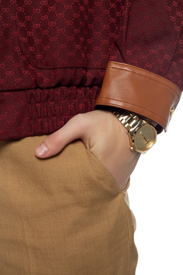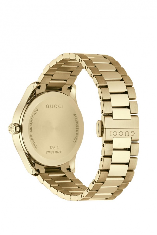 Gold-tone ‘G-Timeless’ quartz watch from Gucci. Made of stainless steel. Logo-engraved closure. Dial embellished with decorative geometric elements in gold-tone. Waterproof up to 50 meters.