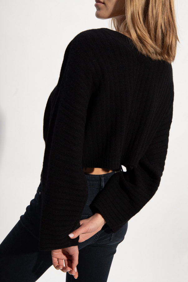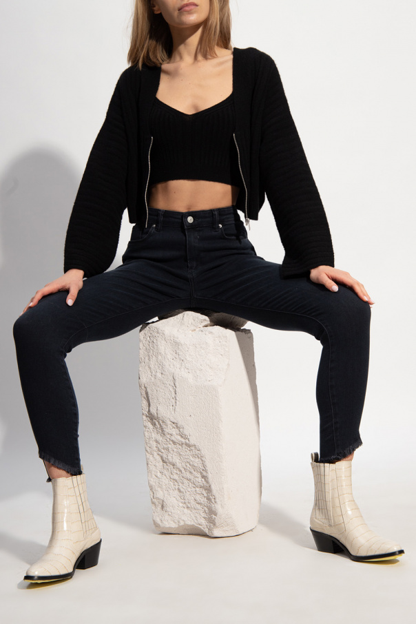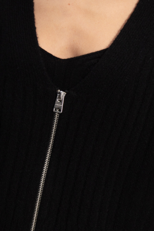 Black ‘Enya’ cropped cardigan from AllSaints. Fastened with a zip, this V-neck design has long sleeves.