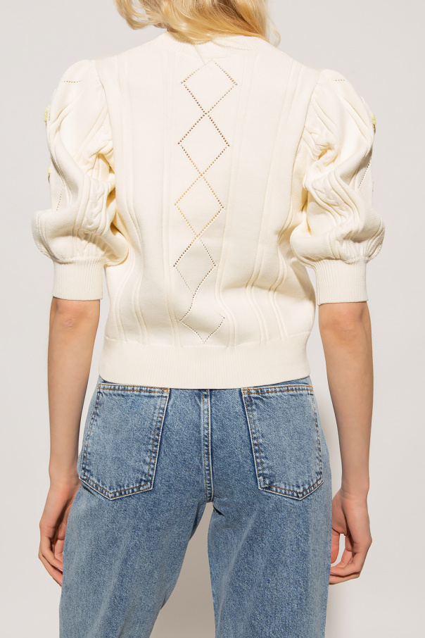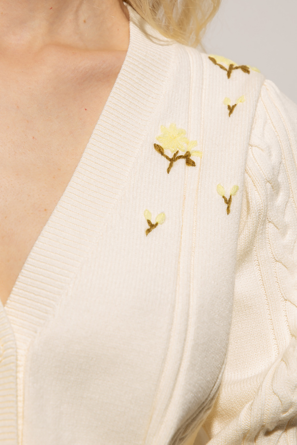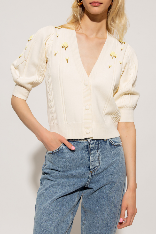 Cream ‘Donnie’ cardigan from Notes Du Nord. Crafted in a rib-knit design, this style features a V-neckline, three-quarter, cropped sleeves and green and yellow floral embroidery.