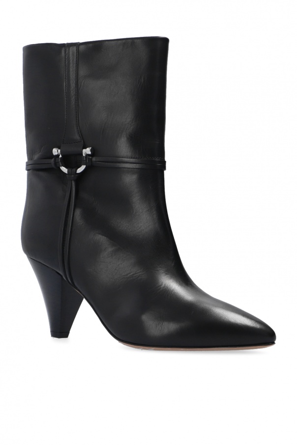 Black ‘Lilet’ heeled ankle boots from Isabel Marant. Crafted from leather, this slip-on design features straps, a decorative silver-tone appliqué and a brown rubber sole.