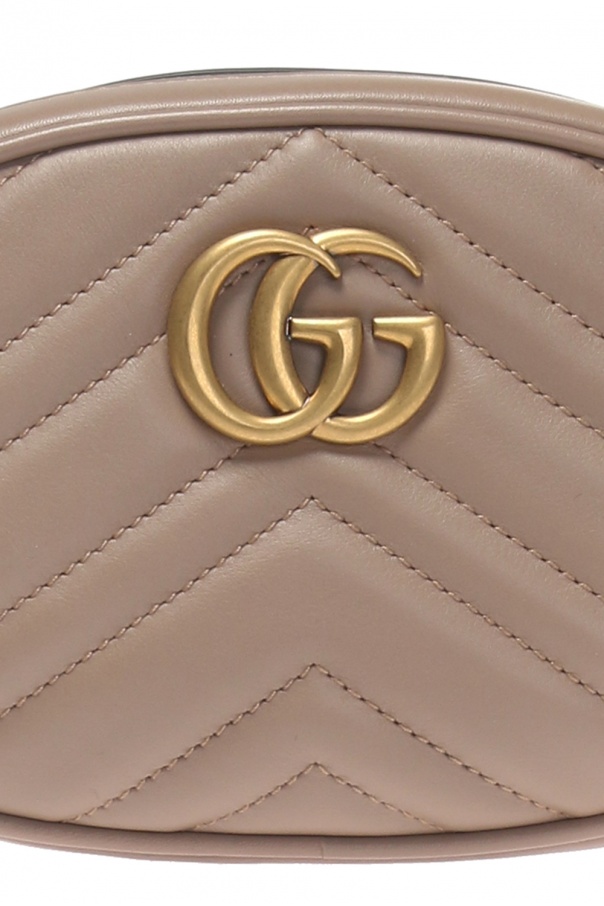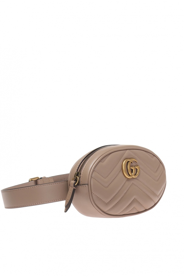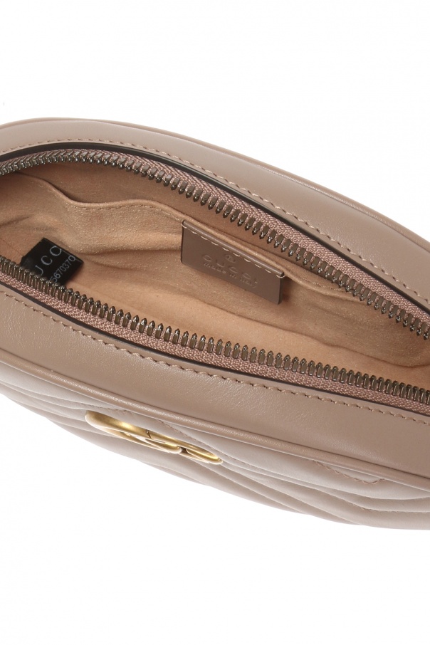 Beige ‘GG Marmont’ rounded belt bag from Gucci. Made of leather. Fastened with zip. Enriched by stitching details, metal GG detail and embroidered heart. Detachable and adjustable waist belt. Interior has 1 compartment and 1 slip pocket. Gold-tone metal hardware.
