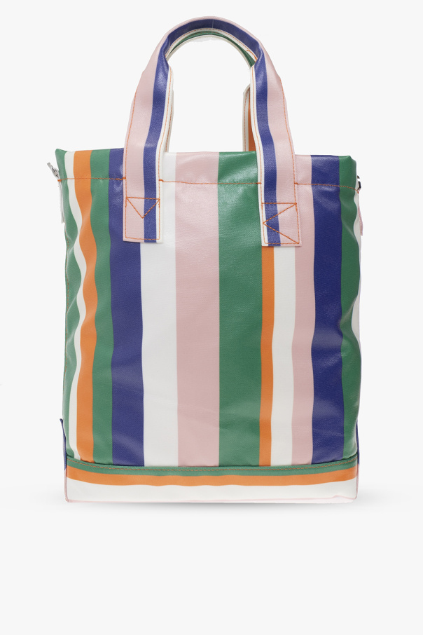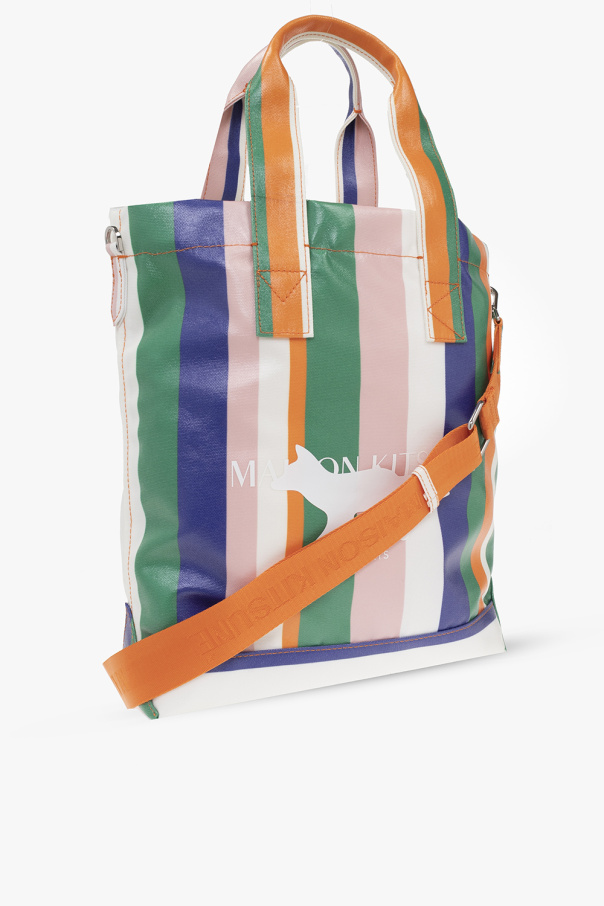 Multicoloured shopper bag from Maison Kitsune. Crafted from coated canvas, this design secures with a magnetic snap and showcases a stripe pattern and printed white logo. It is complete with a detachable and adjustable shoulder strap, two half-round handles, silver-tone metal hardware and one internal compartment with a slip pocket.
