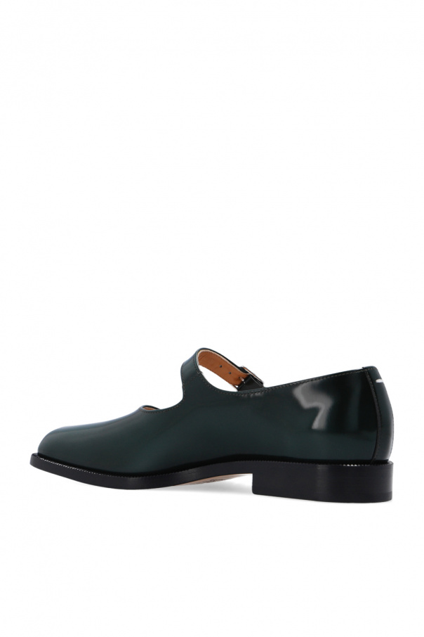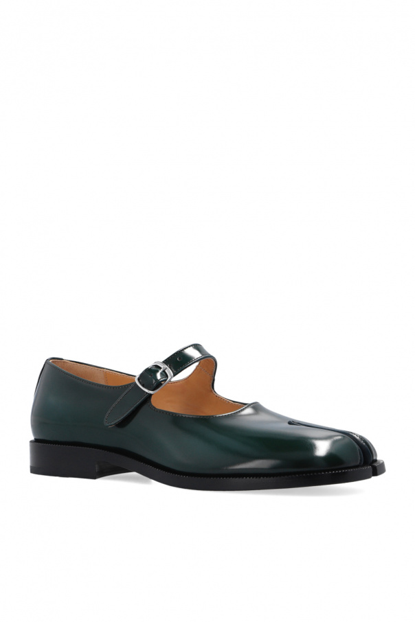 Dark green ‘Mary-Jane’ Tabi shoes from Maison Margiela. Crafted from bovine leather, this pair features buckle straps, the iconic Tabi toe and leather sole in beige and black.