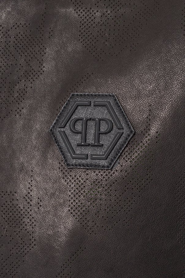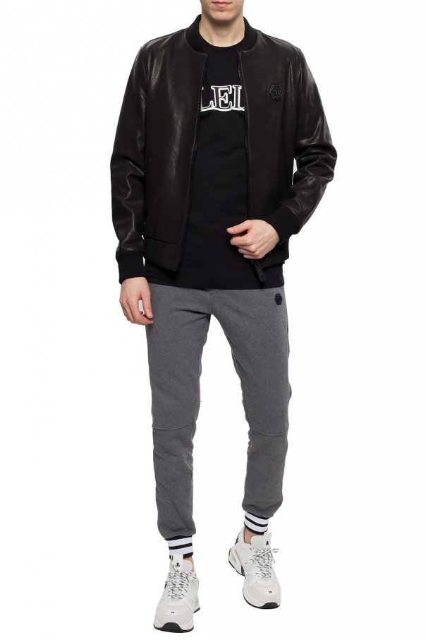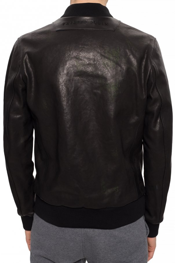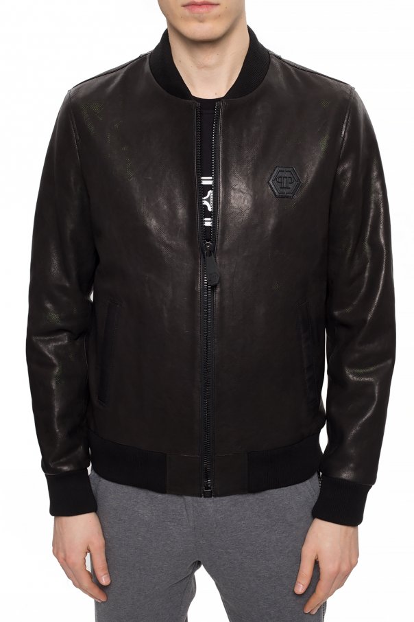 Black jacket from Philipp Plein. Made of sheepskin. Zip fastening. Decorated with a sewn-on logo applique. Two snap pockets on the front. Elasticated hem and cuffs.
